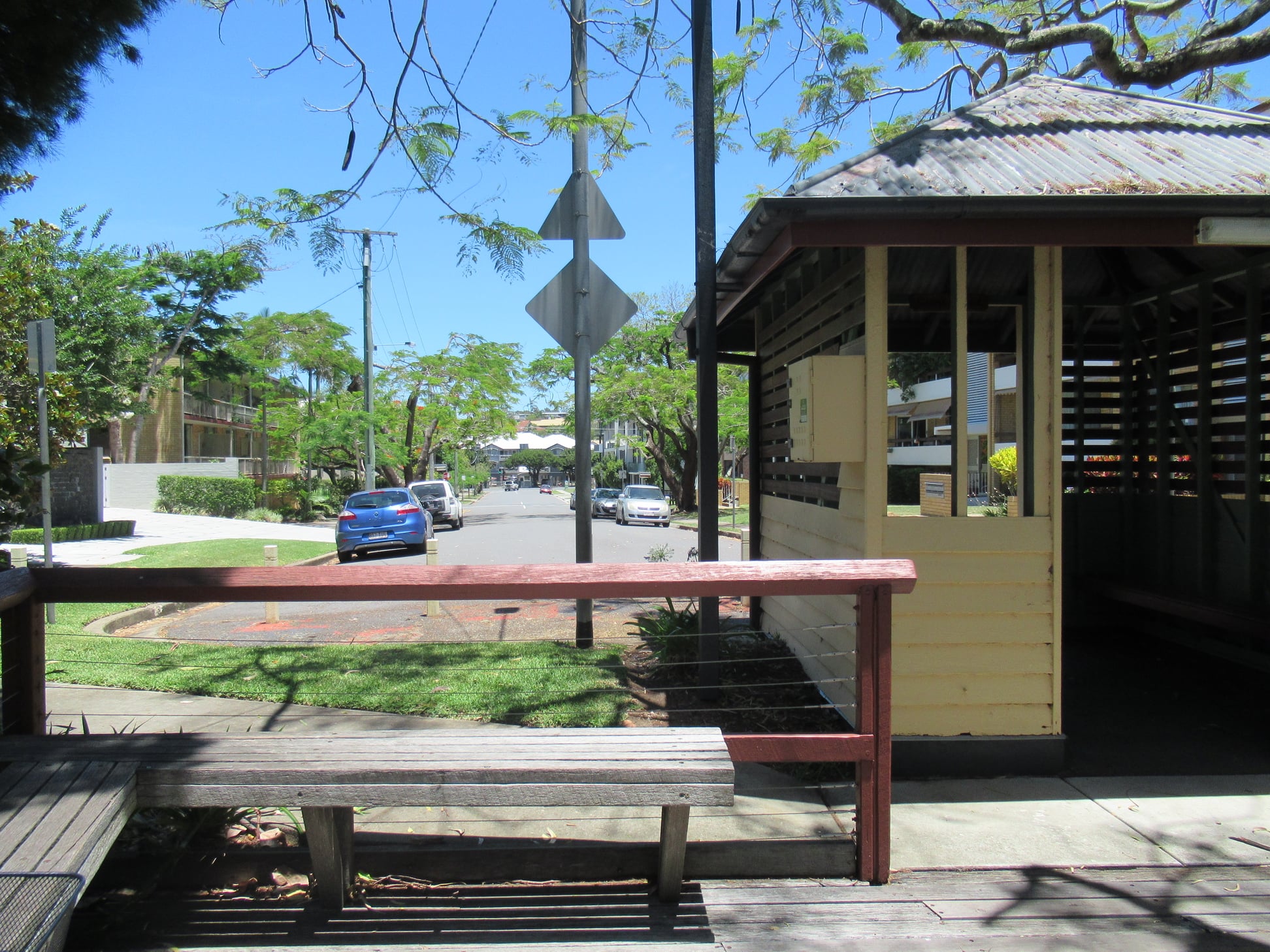 Ryan St provides a reasonably flat cycling connection to Hoogley St, but it’s typically lines with parked cars, and only has narrow footpaths. It would not readily support a frequent bus service, so accessing public transport would involve a substantial walk to an existing stop.