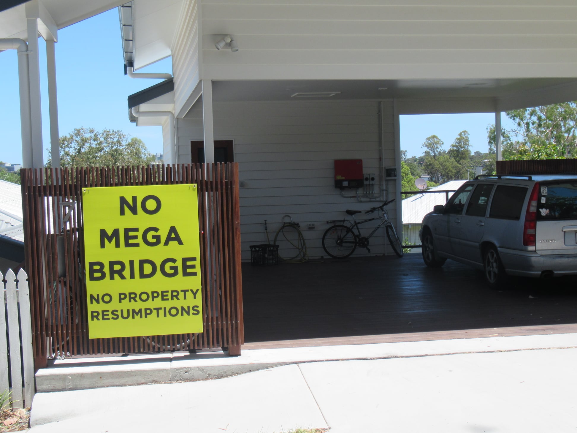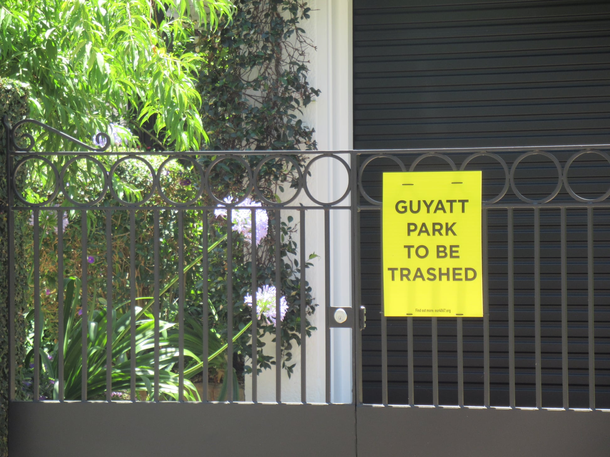 We also note that the “Guyatt Park to be trashed” sign spotted on a nearby resident’s fence lists the web site our4067.org which is no longer active, but which was previously registered to the St Lucia Community Association. James Mackay – who is now councillor for Walter Taylor Ward – was previously president of that group, and was quite outspoken when a bridge from St Lucia to West End was included in the University of Queensland’s 20 year Master Plan. From St Lucia News: