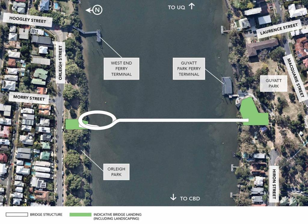 So, in light of that, let’s take a look at the various options put forward for locating a walking and cycling bridge between West End and St Lucia.