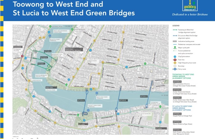 As we’ve noted in our review of the options for a bridge between West End and St Lucia, we think the maximum value for cycling will be achieved if these two bridges are delivered in combination. However we still support a green bridge between Toowong and West End even if the St Lucia Bridge is scuttled.