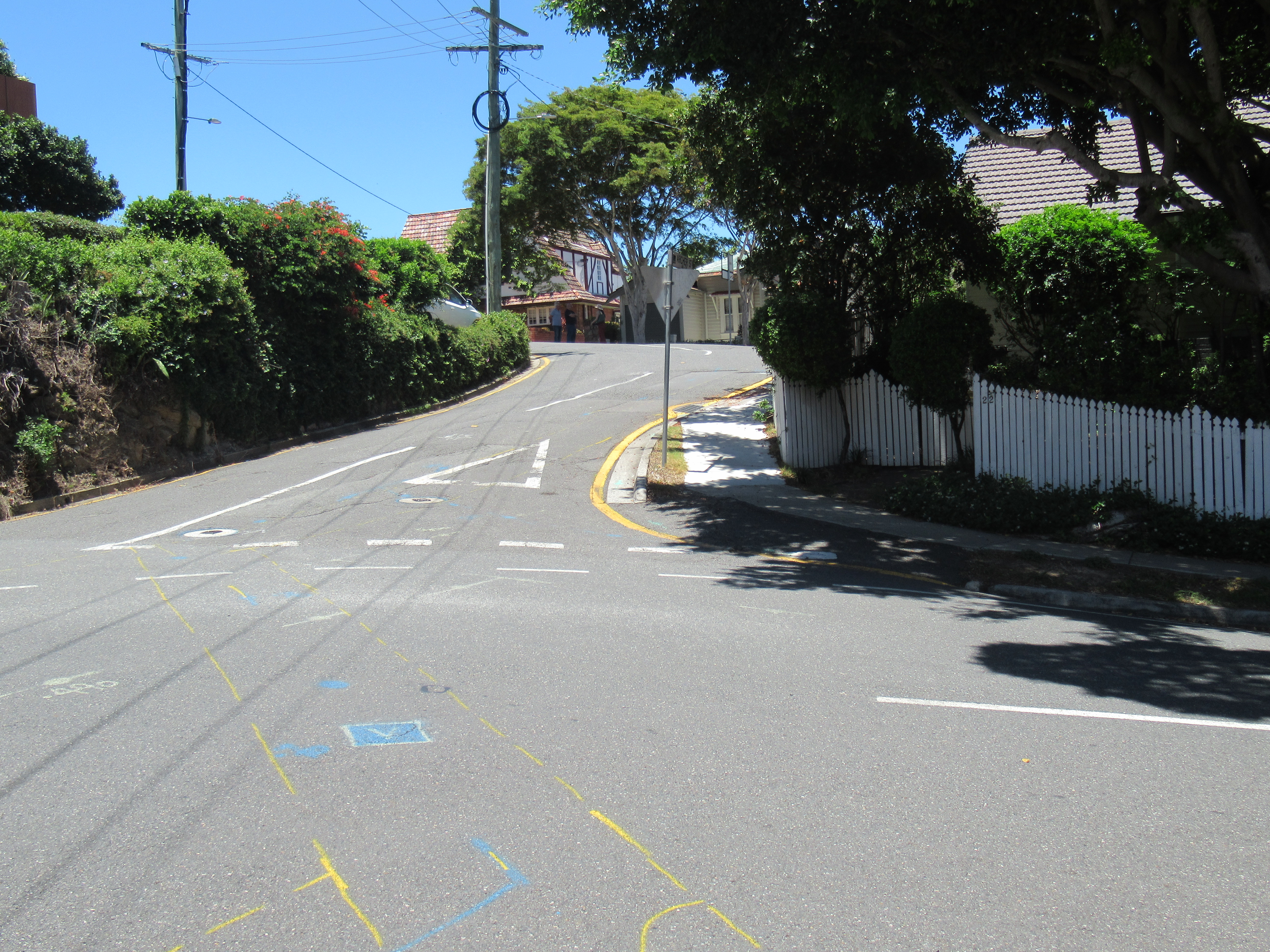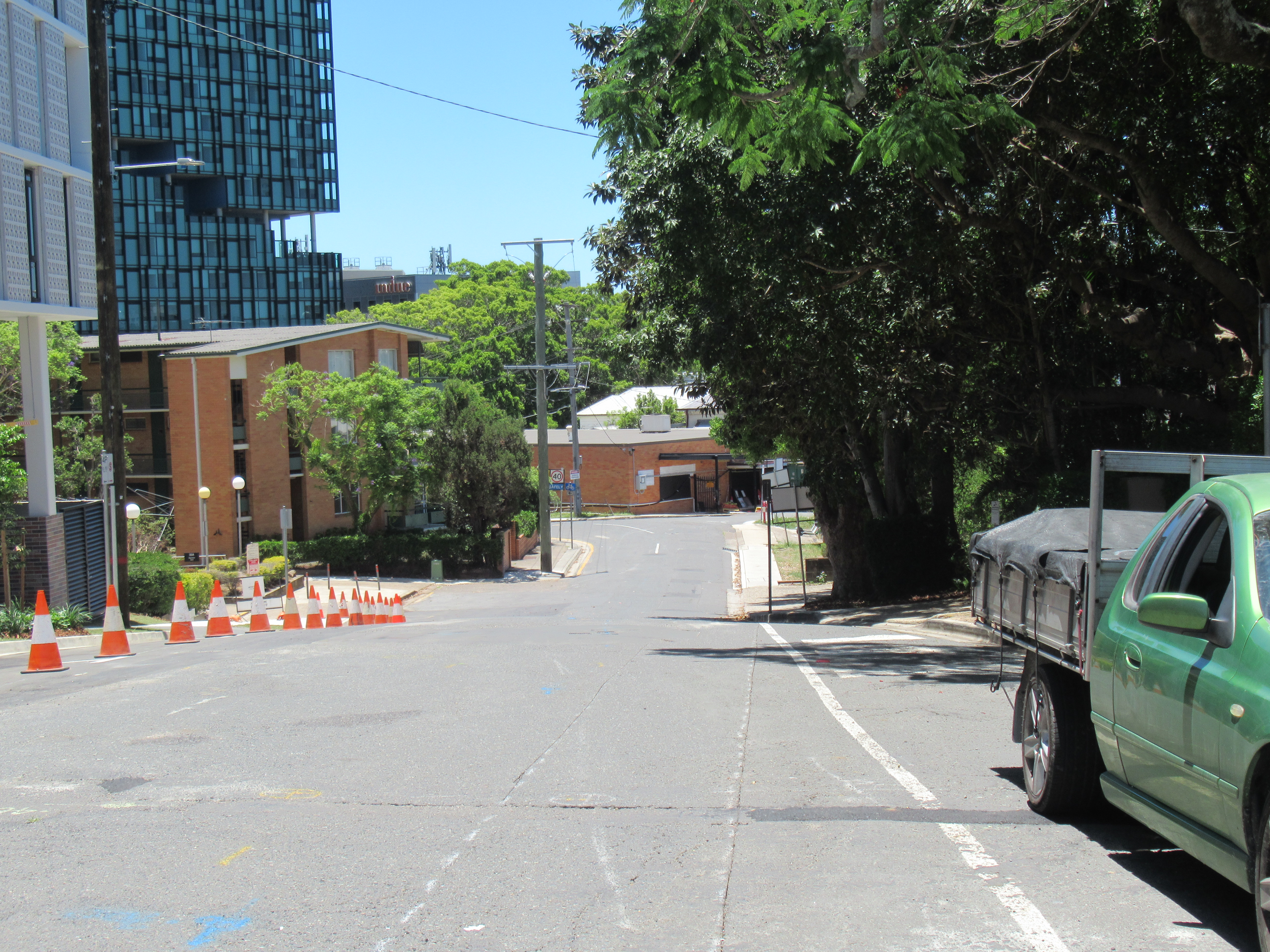 On the Toowong side, this alignment would land at a site which is currently empty, but is in private hands. This block is on the corner of Archer St, near the corner of Glen Rd, and appears to almost share the road access with the driveway of the neighbouring property. The existing footpath on Archer St at this point is very poor, and there are limited options to improve it or the cycling route due to the terrain.