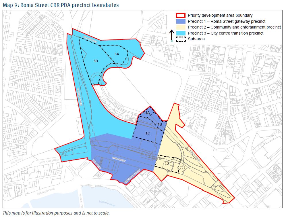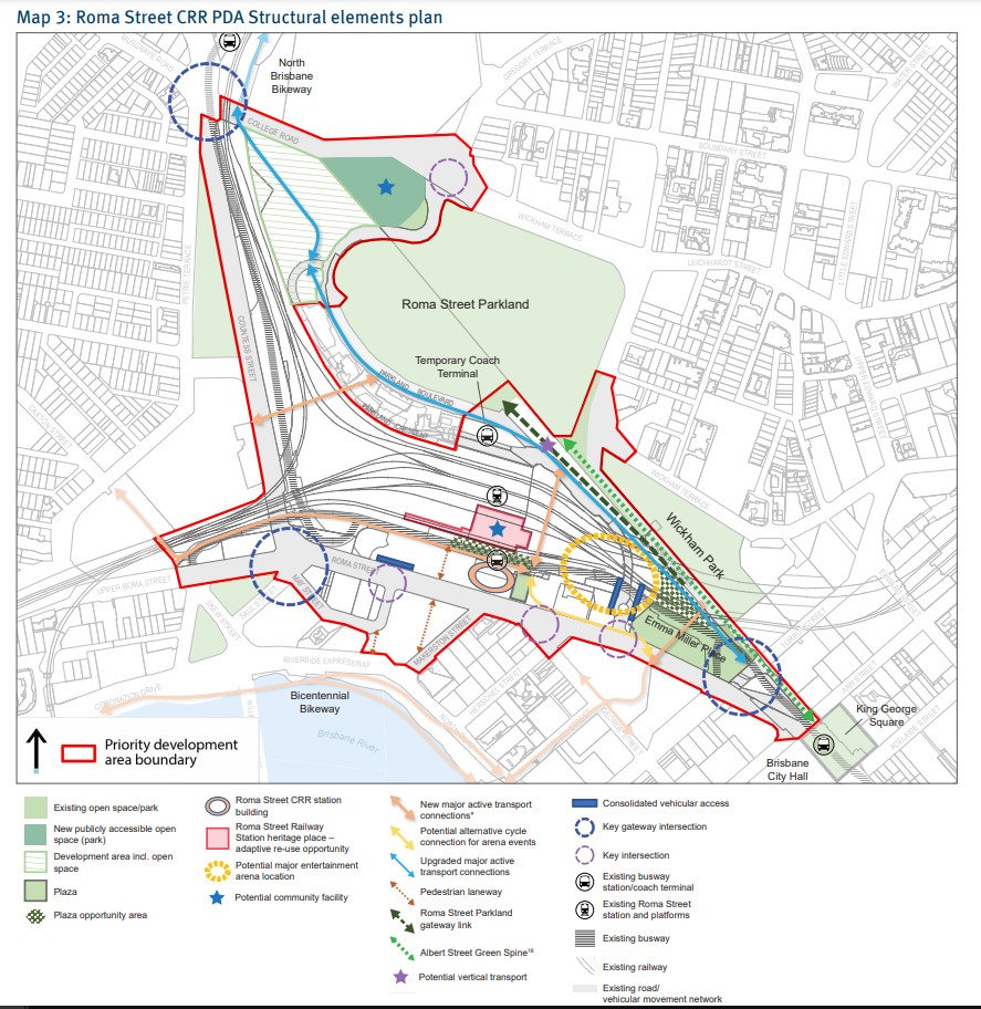 “Deliver a range of major transport connections, including as indicated on Map 3: Roma Street CRR PDA Structural elements plan, which improve pedestrian and cyclist connectivity and universal access within the PDA, and resolve access arrangements for Parkland Boulevard / Parkland Crescent, that address accessibility requirements for development within the PDA and to better connect the PDA to surrounding key destinations including, Roma Street Parkland, Kurilpa Bridge, the Bicentennial Bikeway, Victoria Barracks, Spring Hill, Victoria Park and King George Square.”