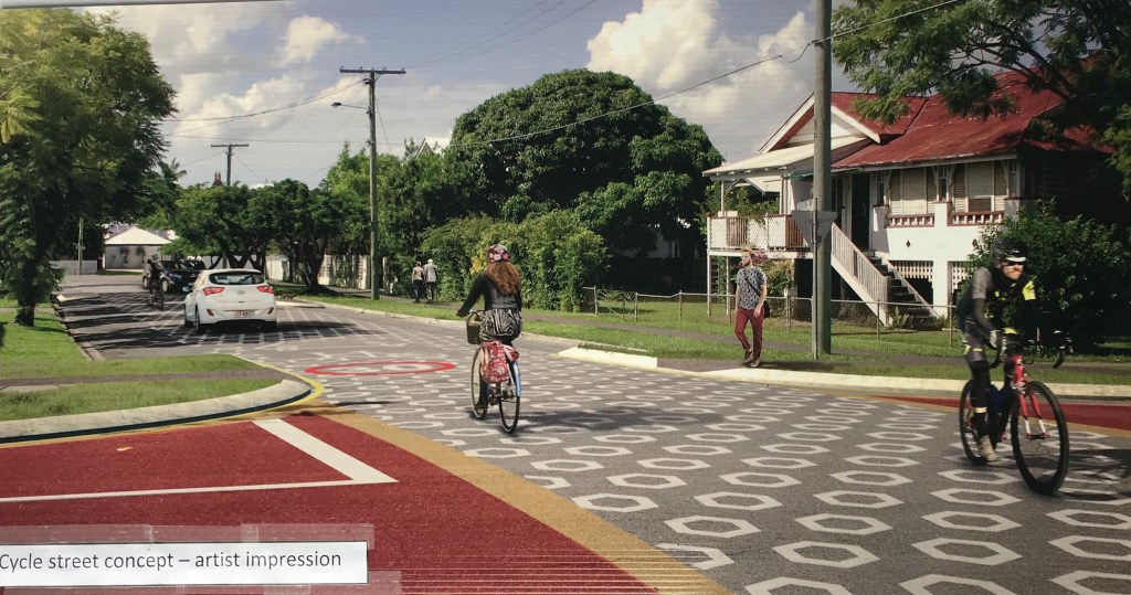 April 2018: Brisbane City Council finally propose a route for Stage 5 of the North Brisbane Bikeway, connecting from Price St, along Kent Rd, Rose St, Park Rd, and Brook Rd to the Kedron Book. This plan included “buffered bikeways” (which would have been the first in Brisbane, pre-dating the Gabba Bikeway on Stanley St) and our first ‘Cycle street’ with a 30 km/h speed limit and clear markings showing motorists that they are sharing with more vulnerable road users. Space for Cycling and Brisbane North BUG promote the consultation sessions for this connection, along with the designs which are somewhat radical for Brisbane at the time.