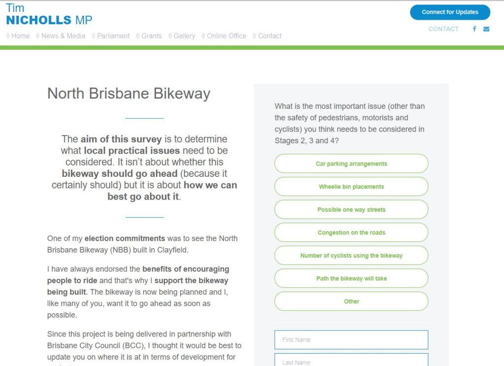 February 2019: Member for Clayfield, Tim Nicholls MP sends out a survey to his constituents about the TMR component of the bikeway (stages 2, 3 and 4), saying “this isn’t about whether the bikeway should go ahead (because it certainly should) but it is about how we can best go about it.”