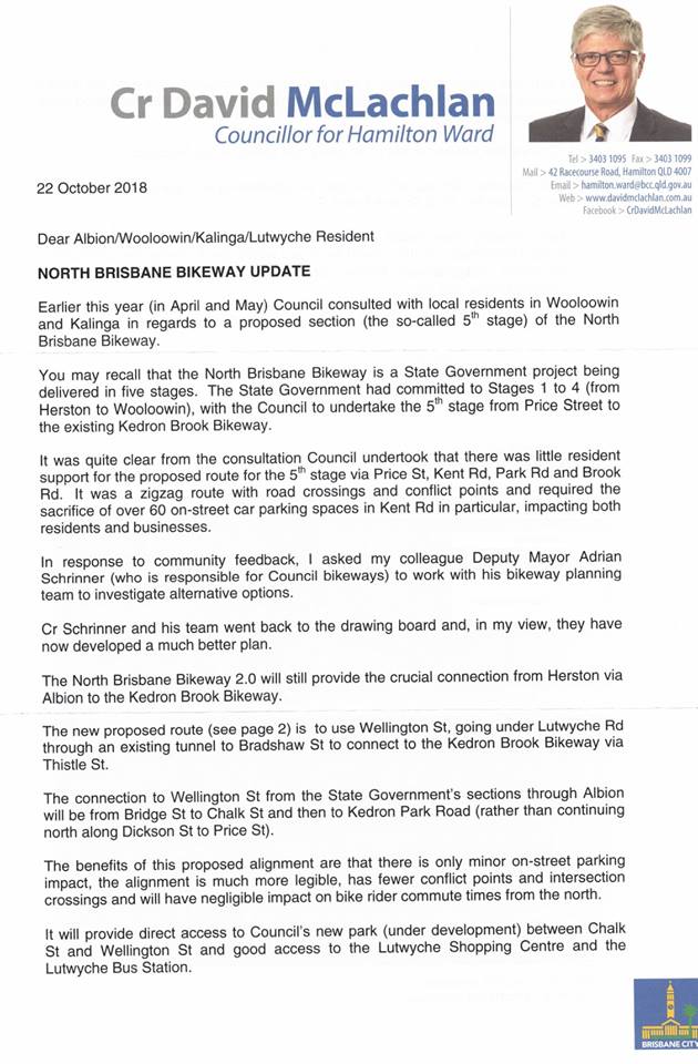 October 2018: Cr McLachlan writes to (some) constituents proudly boasting of his part in causing Council to abandon plans for the North Brisbane Bikeway route via Kent Rd.