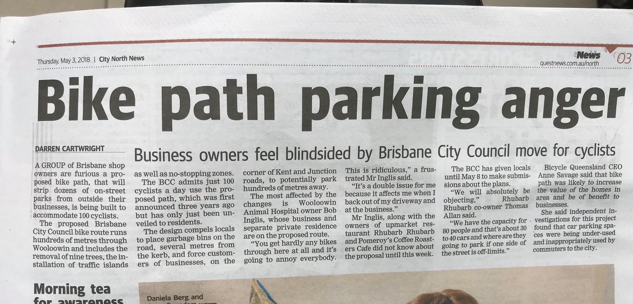 May 2018: The bikelash begins almost immediately, with an article appearing in Quest Newspapers on 3 May 2018, with business owners objecting to the ‘loss of parking’ on Kent Rd (see image below).