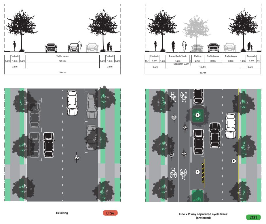 Airport BUG quickly wrote to Transport Chair, Cr Ryan Murphy highlighting that there is in fact room for a protected bikeway plus two lanes of motor vehicle traffic and a row of on-road parking all within the current 12.8m paved roadway. Alternatively, we noted that there is ample room for a 2.4m shared path on either (or both) sides of Sugarmill Rd within Council’s road reserve.