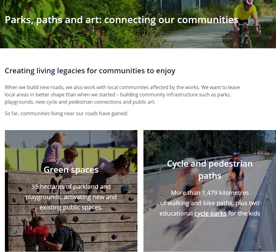 We also highlight that as part of Transurban’s charter, they claim: “We want to leave local areas in better shape than when we started – building community infrastructure such as parks, playgrounds, new cycle and pedestrian connections and public art.”