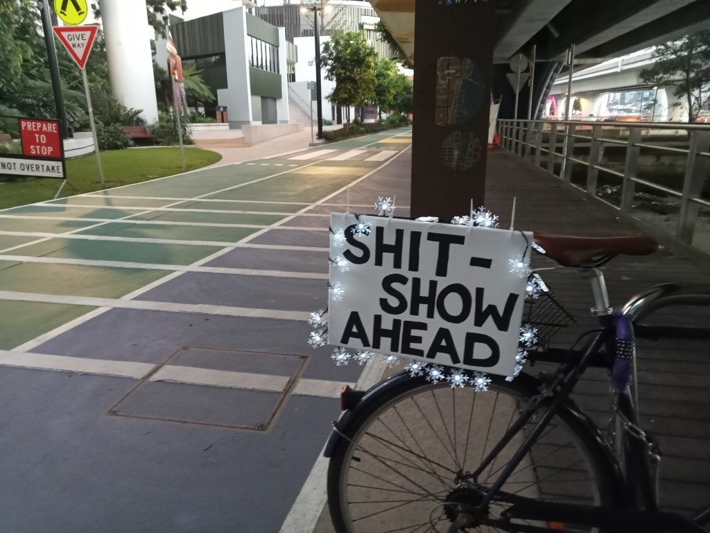 A search of the Queens Wharf Brisbane website then turned up an event notification. There we discovered that Star Casino would be blocking cycling along the Bicentennial Bikeway and Queens Wharf Road, for their Sono Lumo event for 10 evenings in December, starting on Wednesday 4th until Sunday 8th, then again 11-15 December. We discovered that event was to include pop-up restaurants and bars and static lighting features across the (commandeered) public realm, plus a nightly light & sound show to be held each hour at 7:30pm, 8:30pm & 9:30pm on the façade of The Star Brisbane.