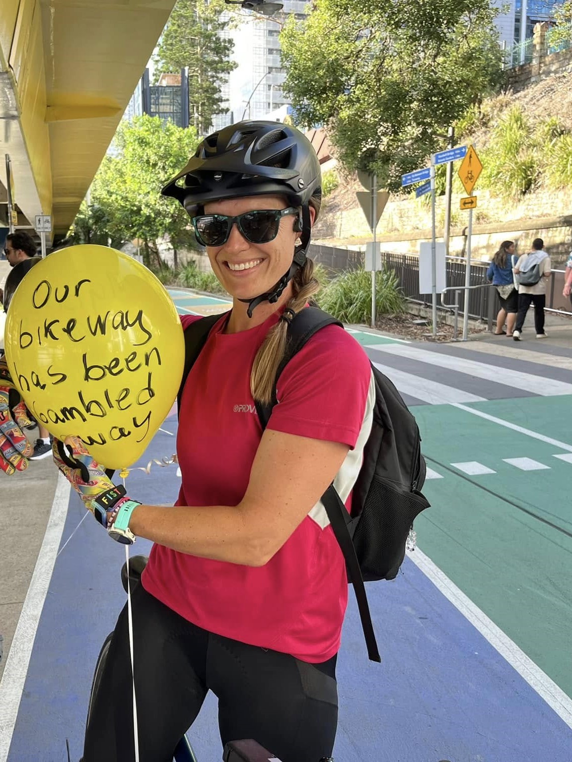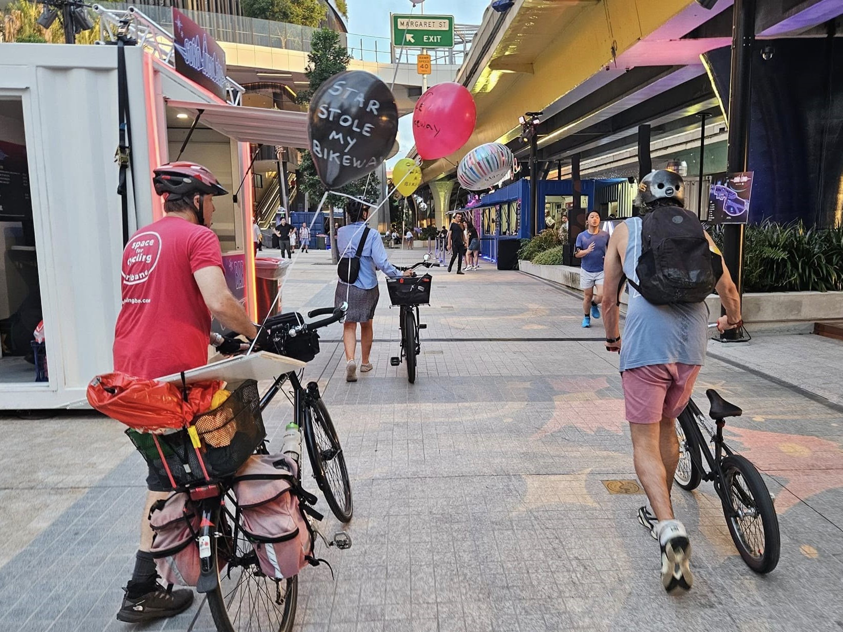 Attention from our protest then prompted Bicycle Queensland to more forcefully and publicly take up the case of the Bicentennial Bikeway. Thanks to them, Star Casino agreed to not enforce the dismount until it was necessary for safety reasons—which we hoped would be after the peak evening commute times.