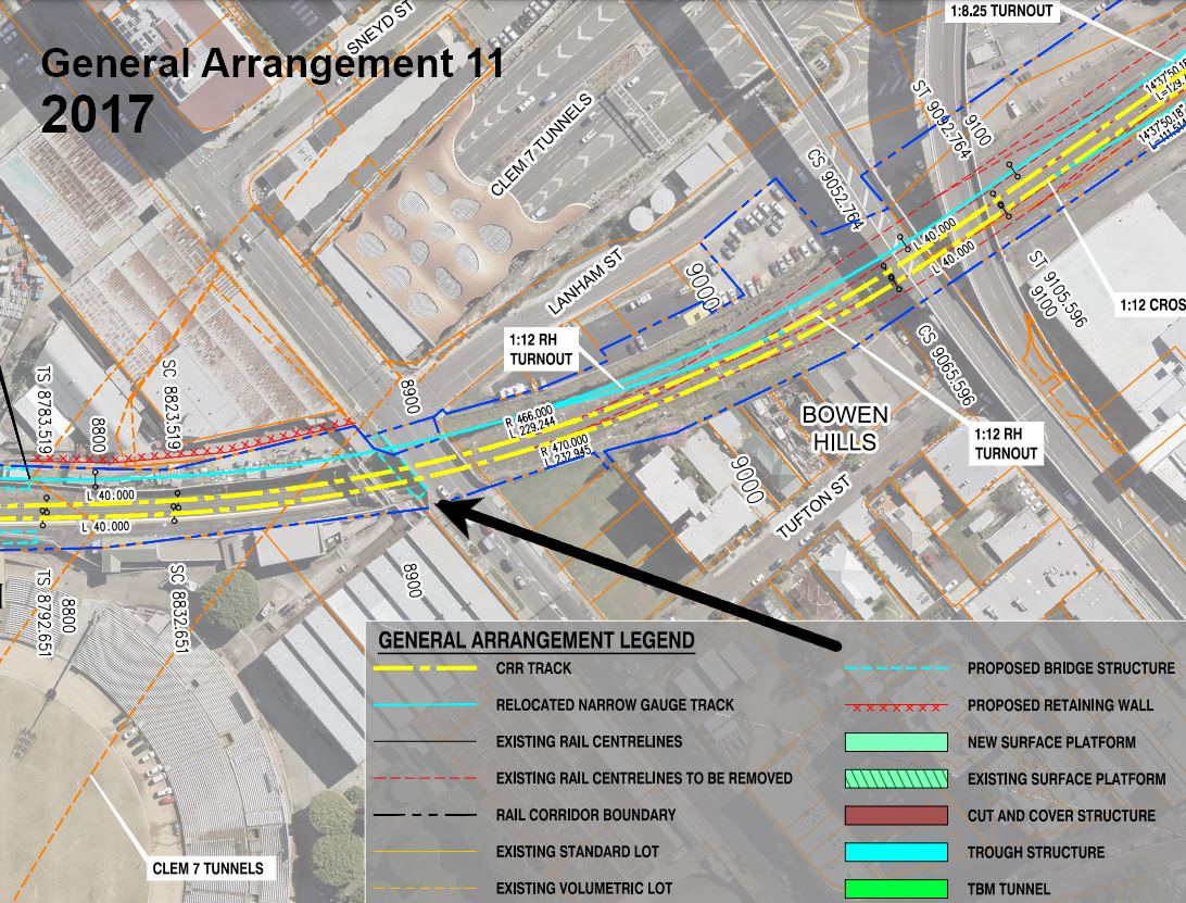 Thanks to one of our followers highlighting the issue on social media, we looked back carefully over the history of the Cross River Rail project documentation, including the change requests since 2017. We can see that a new “proposed bridge structure” was shown in the approved plans from 2017 – see “General Arrangement 11” with the relevant section marked-up below.