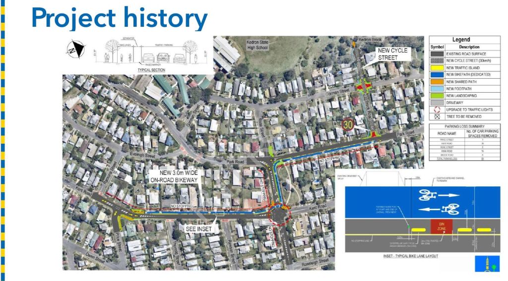 Cr Dixon instead expressed support for a concept design which was released back in 2018 proposing an alternative east-west route via Price Street, Kent Rd, Rose Street, and Park Road, connecting to the Kedron Brook Bikeway at Brook Road. We note that the previous Hamilton Ward Councillor helped fan opposition to that alignment, so we’re curious as to what has changed in the intervening 8 years.