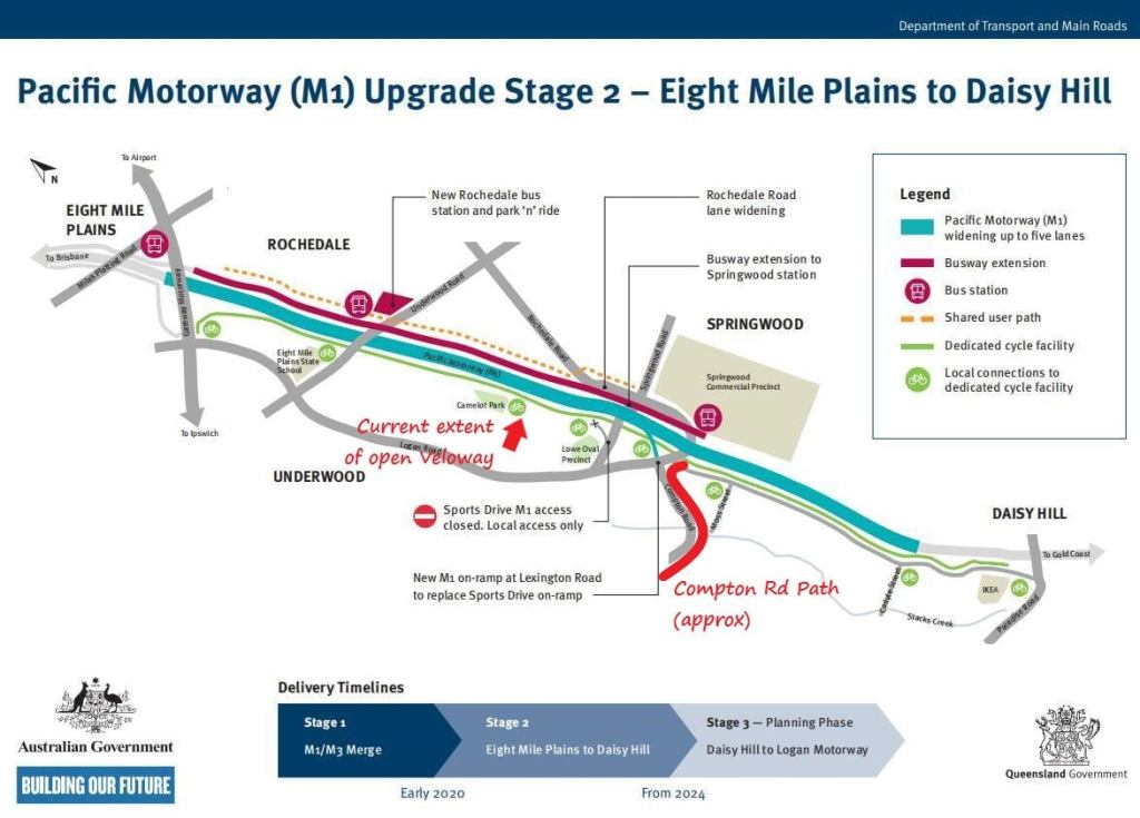 This is a highly industrial area, so provides a really useful link for people walking, cycling and e-scooting to work. It also connects to the latest section of the Slacks Creek Bikeway (more on that below). The connections at the eastern end are all quite messy at the moment, but once the Veloway works are finished, we anticipate this will be a well-used link.