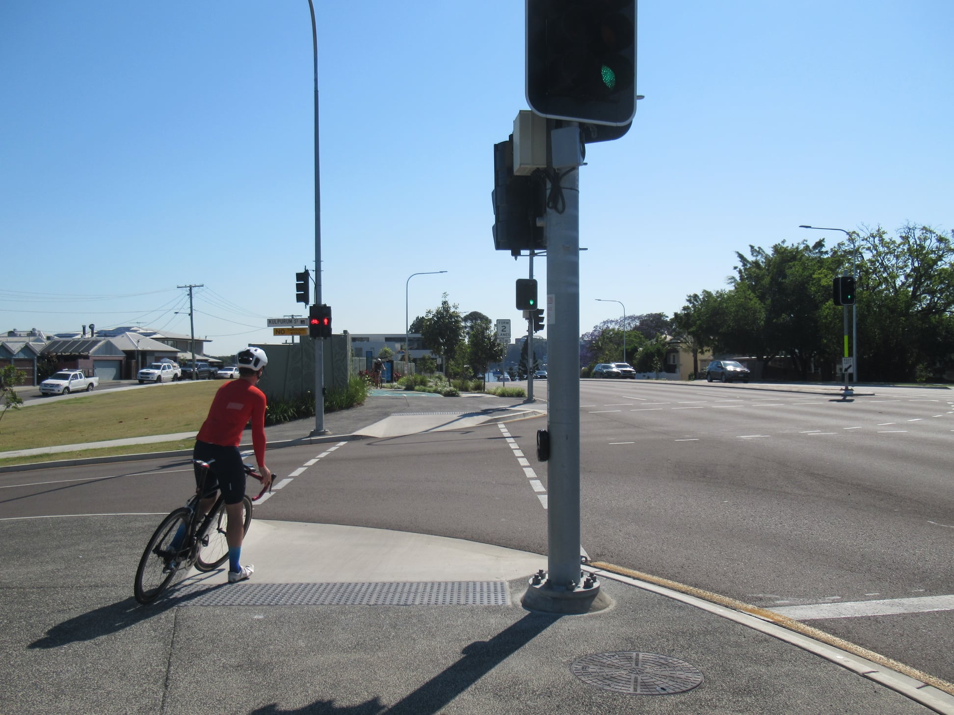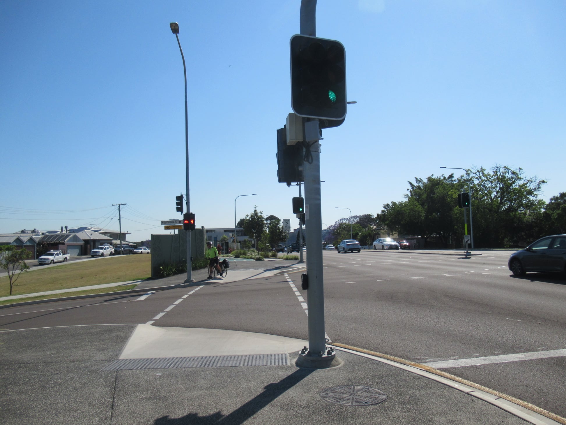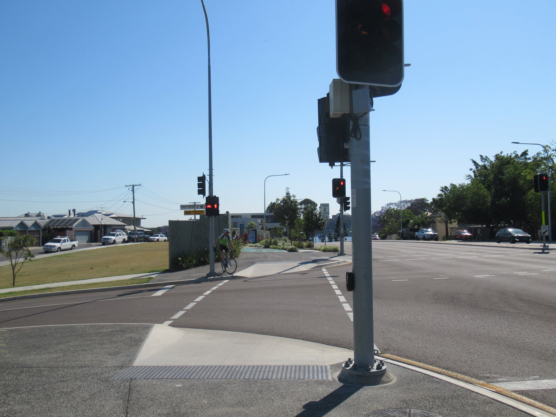 When the bikeway along Lytton Rd, East Brisbane was planned as part of the road-widening project, we were assured that people cycling (and walking) would have the same priority as if they were travelling on the road – i.e. they would not have to stop and wait at the intersection with Kulpurum St unless there were vehicles actually waiting to turn in or out of that minor side street.