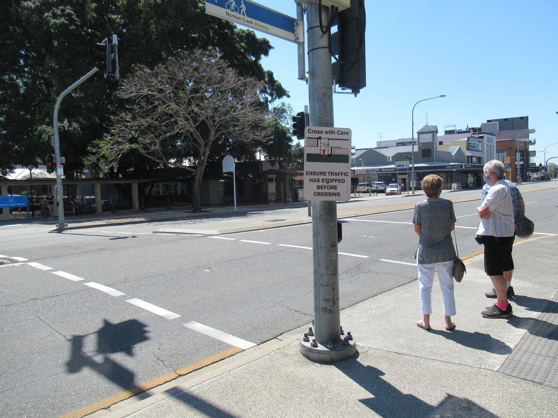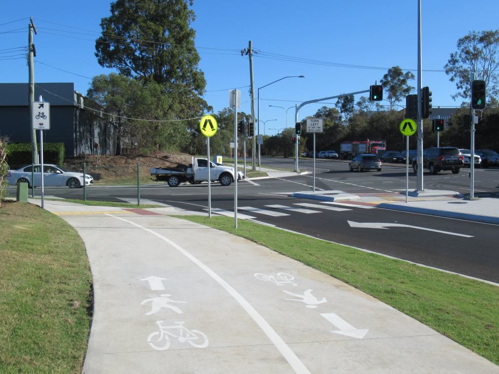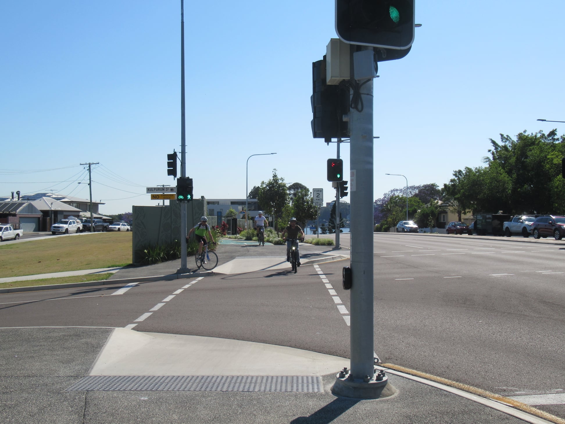 When the bikeway along Lytton Rd, East Brisbane was planned as part of the road-widening project, we were assured that people cycling (and walking) would have the same priority as if they were travelling on the road – i.e. they would not have to stop and wait at the intersection with Kulpurum St unless there were vehicles actually waiting to turn in or out of that minor side street.