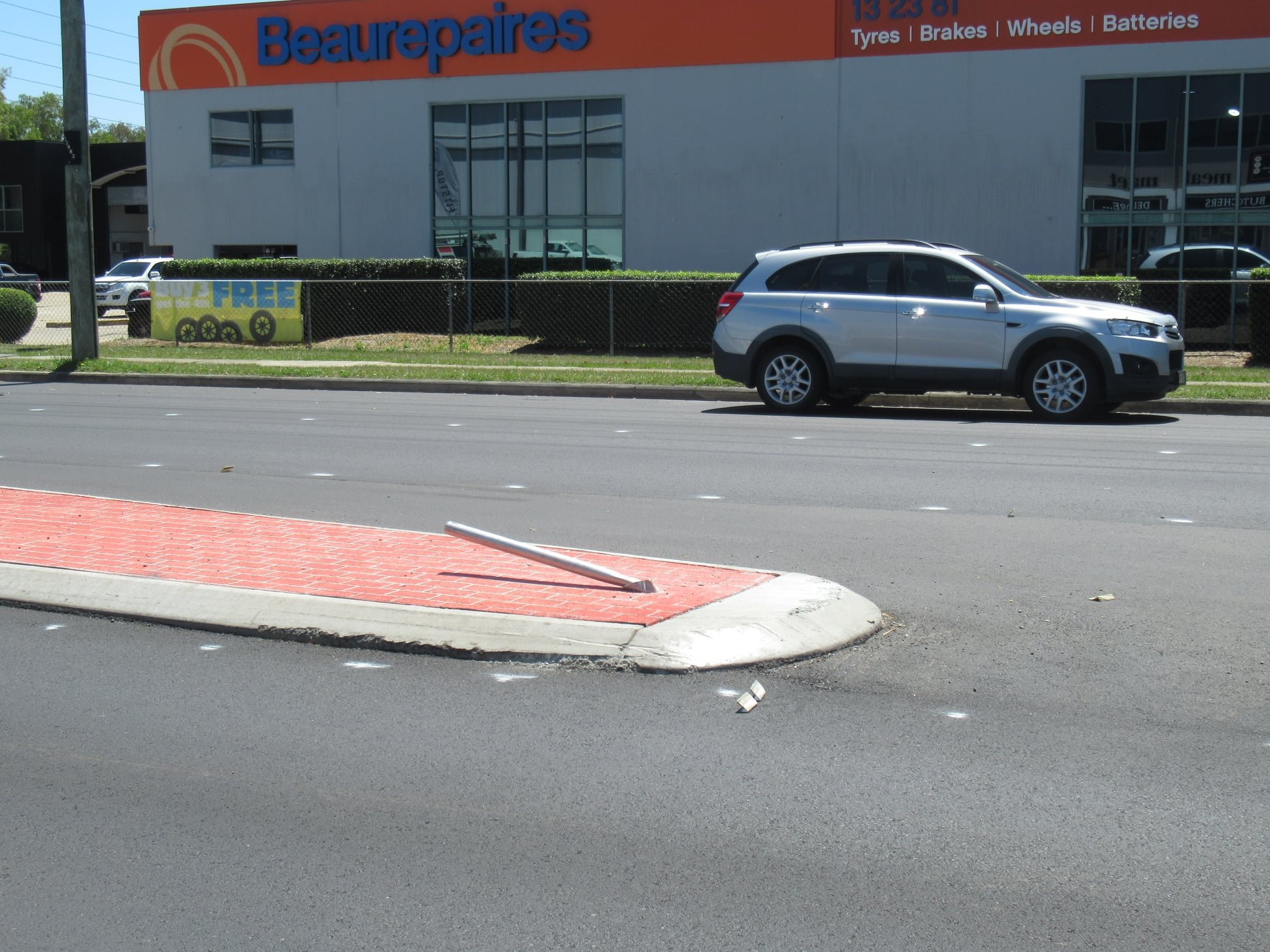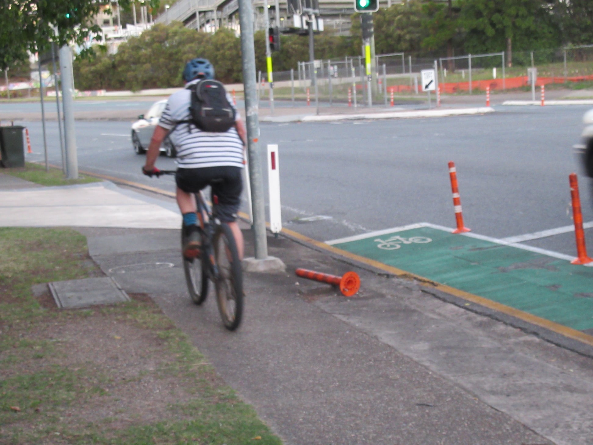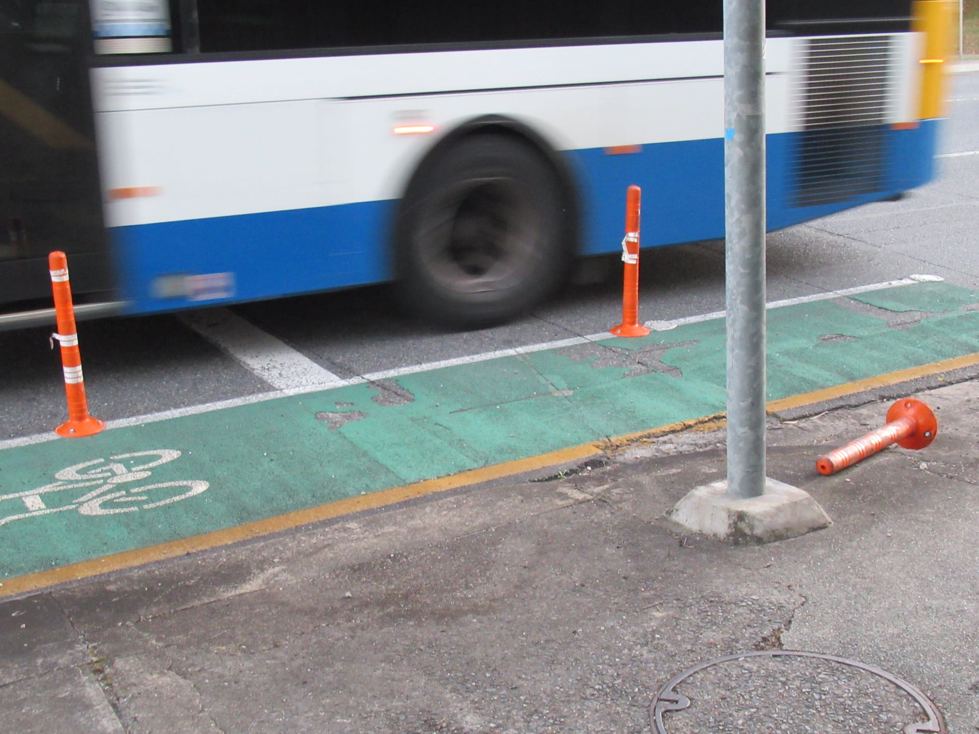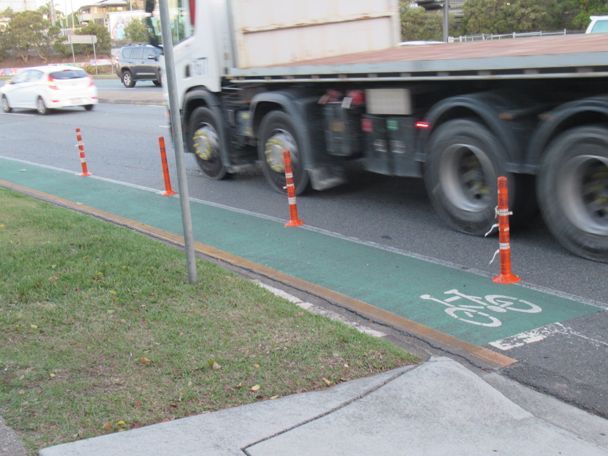 - 3 of the orange plastic bollards on Wynnum Rd at the approach to Junction Road have come unstuck, but the rest are still hanging on.