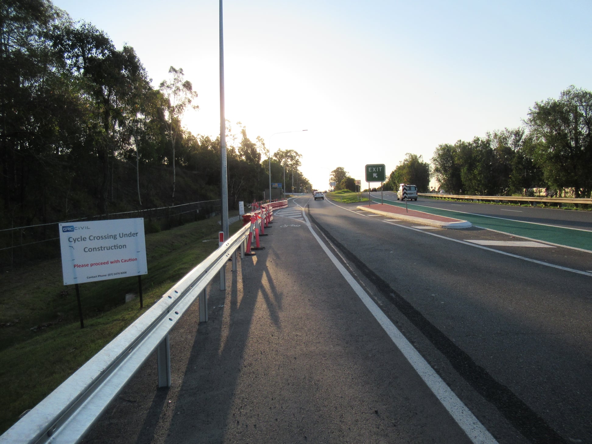 This week marks a year since Easy BUG first posted about the project by TMR to “upgrade” the Gateway Motorway on-ramp from Old Cleveland Rd. The work to replace the cycle crossing (which was not part of the original plan) is still not complete.