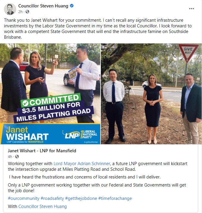 Interestingly, the LNP candidate for Mansfield, Janet Wishart and Councillor Steven Huang have announced that an LNP state government would tip in $3.5 million for an upgrade to the intersection of Miles Platting Road and School Road in Rochedale – despite those both roads being Council controlled rather than the responsibility of TMR. As we’ve highlighted recently, Miles Platting Road has zero provision for walking and cycling, which is a big deal, as it connects the suburb of Rochedale to the bus station at Eight Mile Plains. The same goes for School Rd past Council’s planned Metro depot site. So we would welcome improvements—no matter who funds them—as long as they include good quality connected facilities for people to chose active transport.