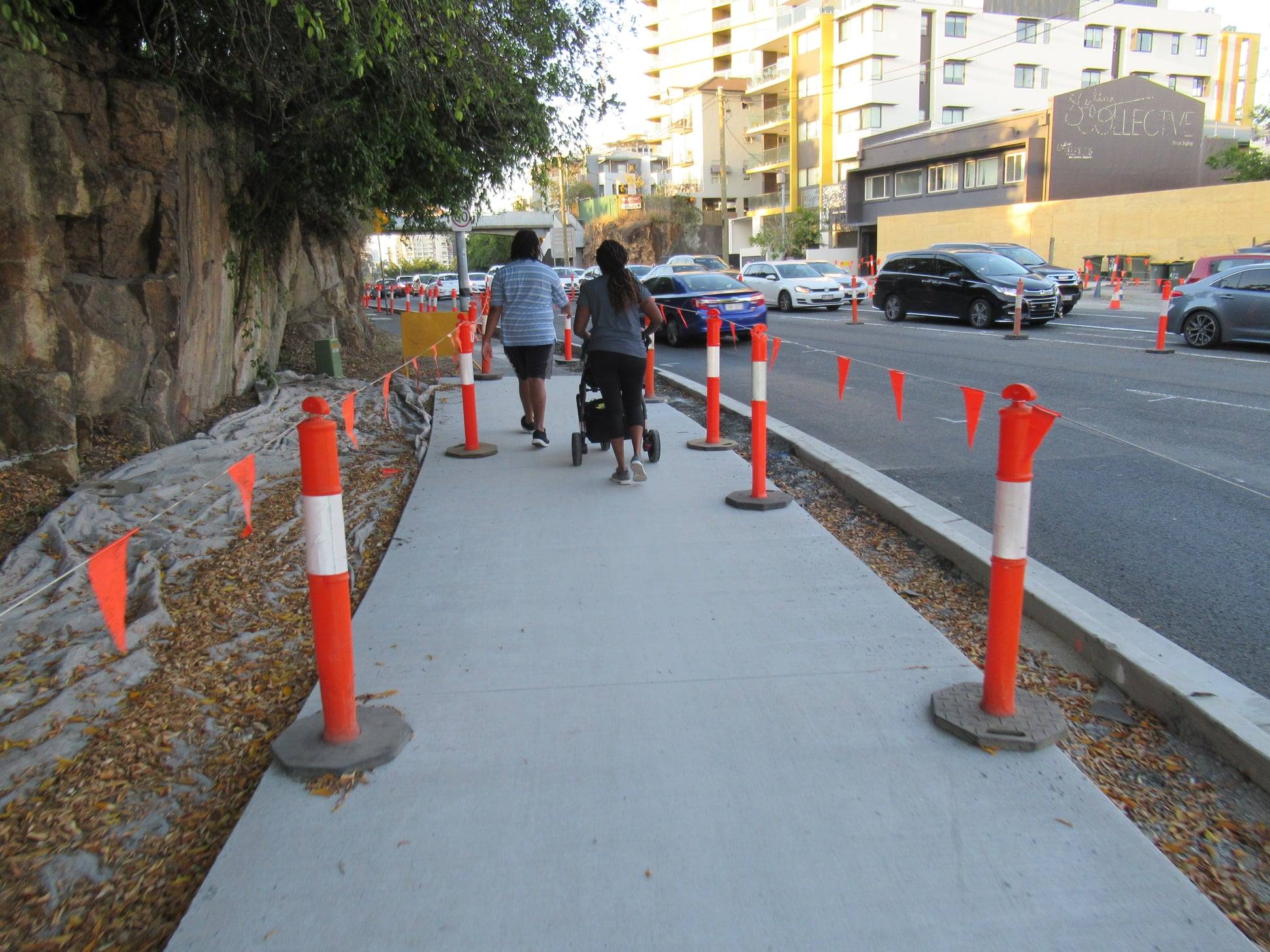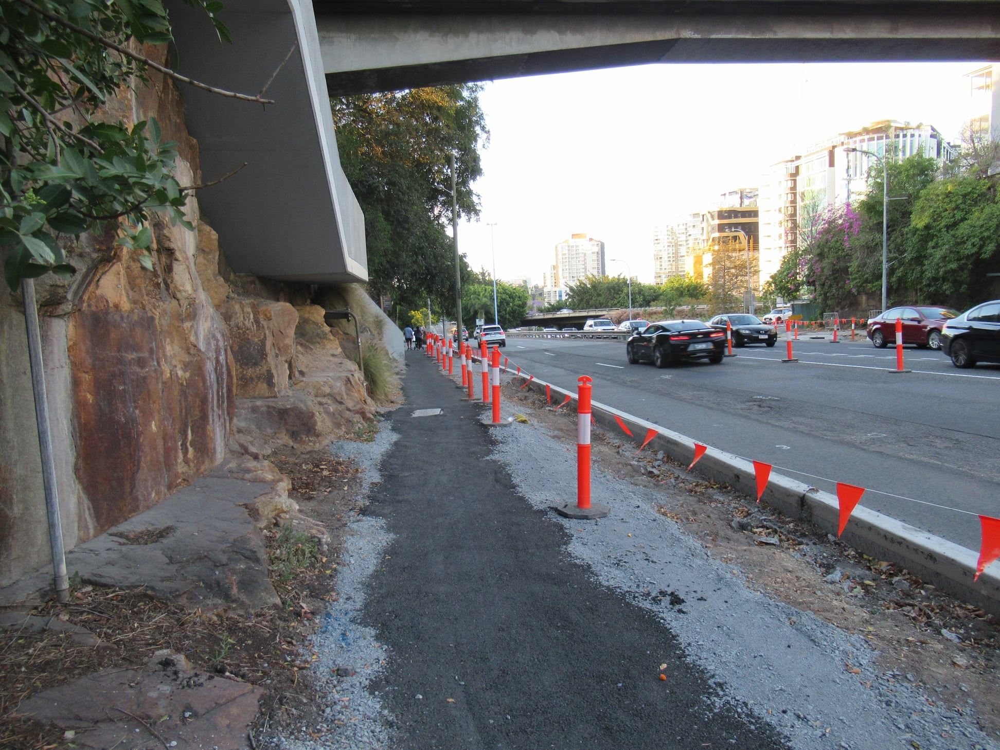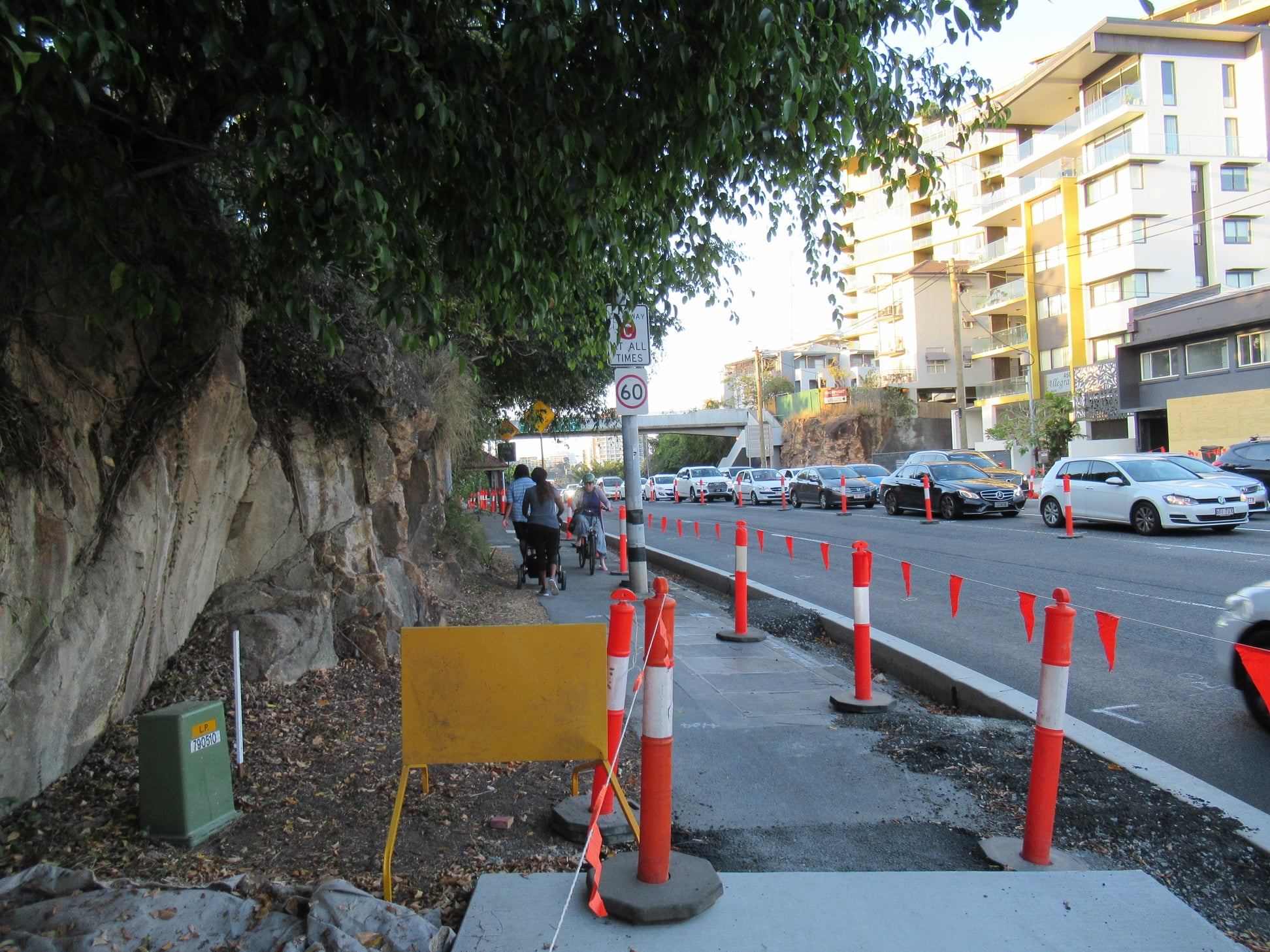 When we and others (in particular Cr Jonathan Sri, Councillor for The Gabba) highlighted concerns about the project to enlarge the intersection of Main St and River Tce in Kangaroo Point, Council agreed to widen the western footpath a little to bring it up to the 2.5m minimum requirement to be classified as a shared path under AustRoads. It’s good to see that now underway.