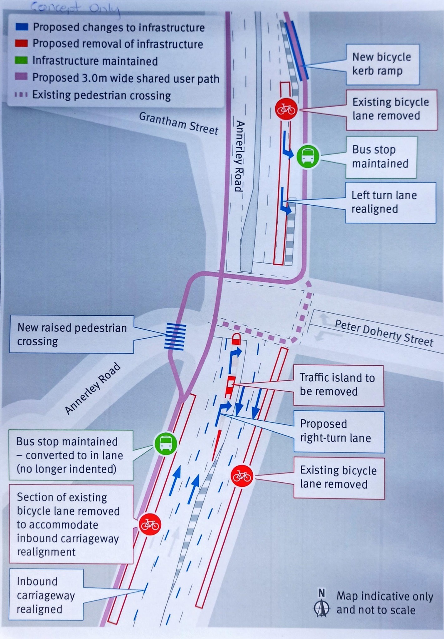 The latest change request for the Cross River Rail project is proposing to add a new right turn lane from Annerley Road into Peter Doherty Street to provide better access for trucks entering the Boggo Road construction site. While there are several proposed plans, the one that appears to be leading involves replacing the on-road bike lanes on Annerley Road between Peter Doherty Street and Gladstone Road with a shared path on the inbound side. This would require outbound riders to cross the road at Peter Doherty Street, and then presumably make multiple crossings again at Gladstone Road to continue their journey along Annerley Road or to connect to the Eleanor Schonell Bridge.