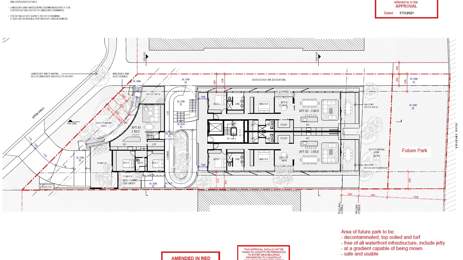 This application and other recent developments along this stretch of river have left the mandated setback for the future Riverwalk (so that it can be on land rather than having to be built out over the river). But the developers have not been required to construct the pathway as has occurred in other parts of the city. The new residents are no doubt enjoying the riverside parkland hidden away behind the buildings, and might be disappointed in future when a paved path attracts other people to ‘their’ riverfront.