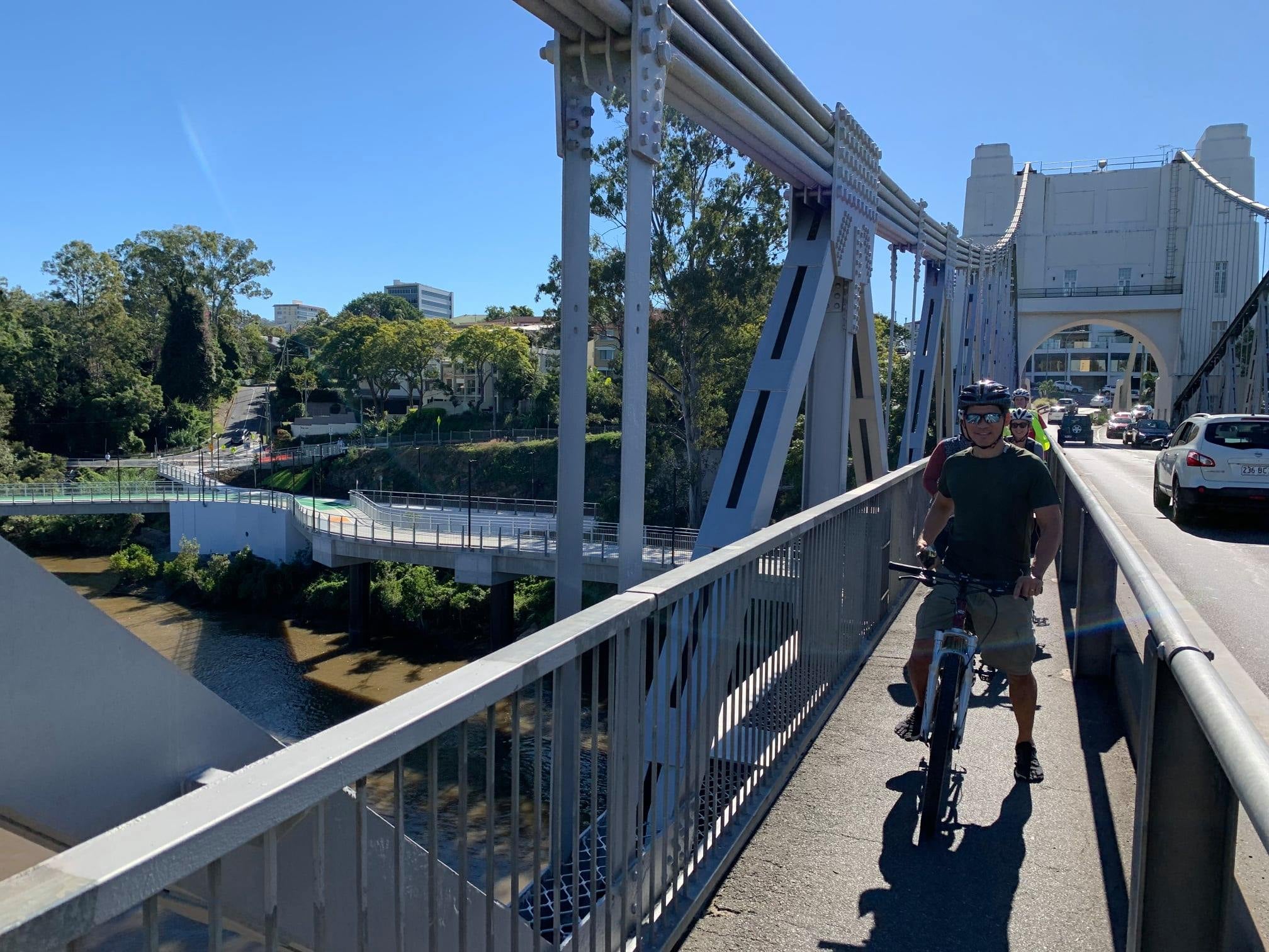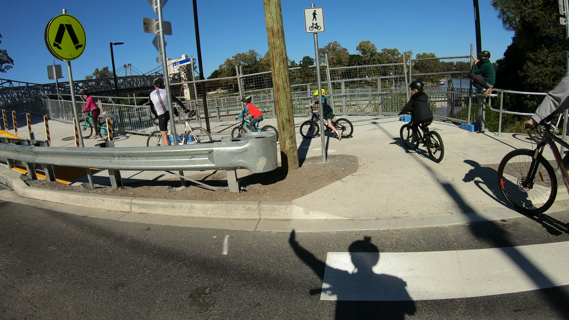 As the group reached the Riverwalk entrance at Twigg Street at 9.45am, the fence was still shut. Despite phone calls and the efforts of Councillor James Mackay, the contractors would not let the group through before the official opening after 11am. Not wanting to miss the festivities, Chris and marshals led the ride onto Radnor Street, and the footpath across Walter Taylor Bridge, then back across Jack Pesch Bridge. That highlighted just how much the Riverwalk is needed; the alternative route was awful.