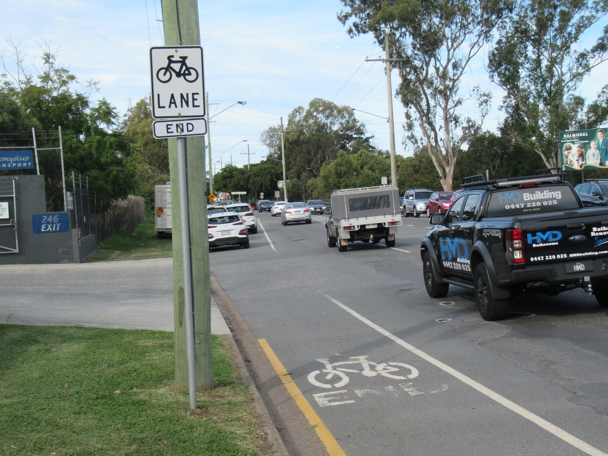 On Lytton Rd, Morningside, East BUG were horrified to see that the on-road bike lanes have been removed to west of Beverley St to create a right-turn lane into Riverside Pl. They weren’t great bike lanes, since they would usually be blocked with parked cars on weekdays, but early in the morning and on weekends they were useful. Now there is nothing.