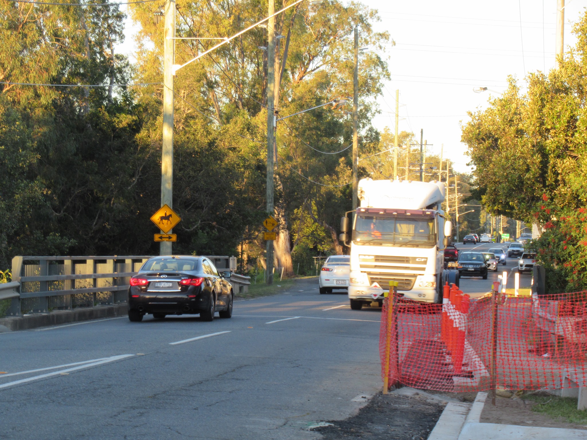 Adding insult to fear of injury: while there is work being done to the narrow footpath on Perrin Creek Bridge there are signs saying “Bikeway maintenance in progress”. What bikeway??