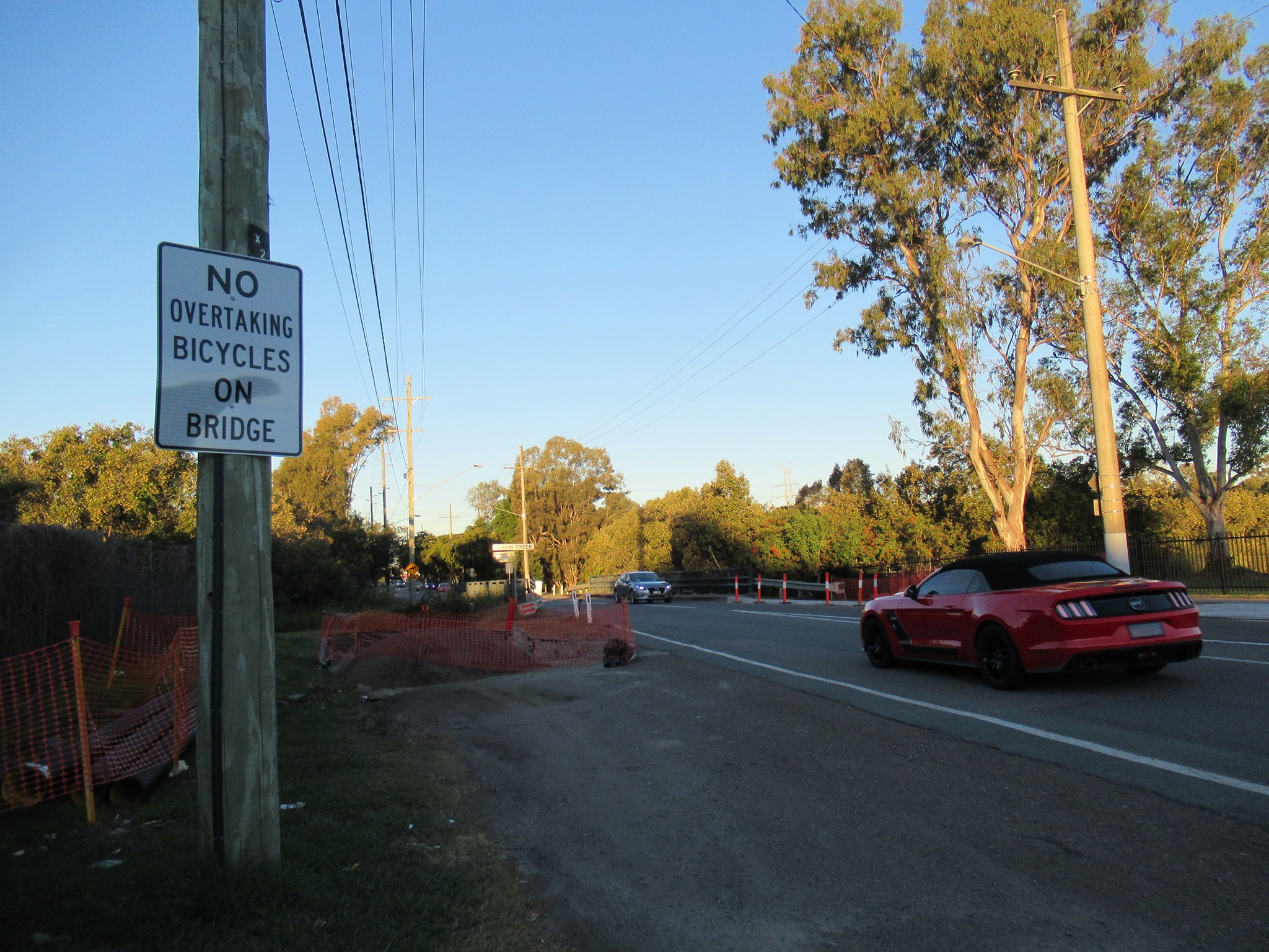 A little further west, there are now signs either side of Perrin Creek Bridge saying “No overtaking bicycles on bridge”.