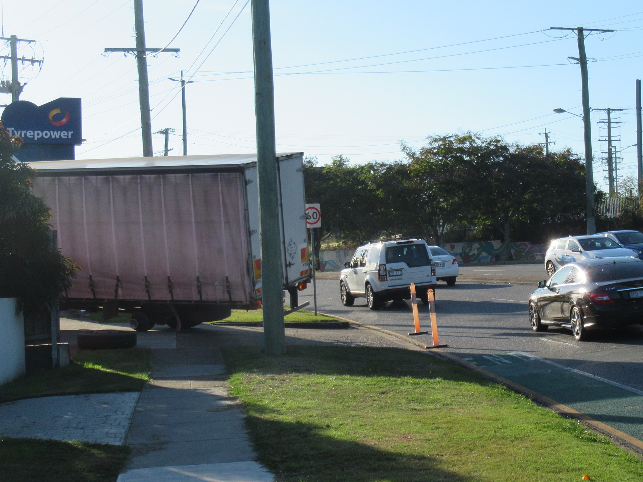 Perhaps Lytton Road just needs some little plastic bollards?? The flexible bollards on Wynnum Road, Morningside guarding the bike lanes near the intersection with Jack Flynn Memorial Drive have now lasted a week longer than we were expecting. In fact we wonder if they have super-powers against trucks when we spotted this one with its wheels fallen off just around the corner in the driveway at 550 Wynnum Rd.