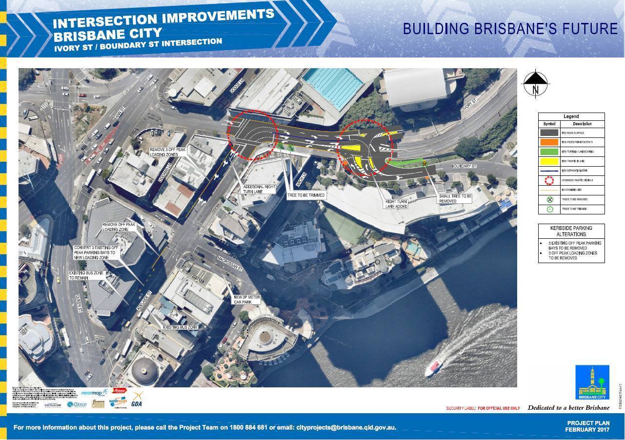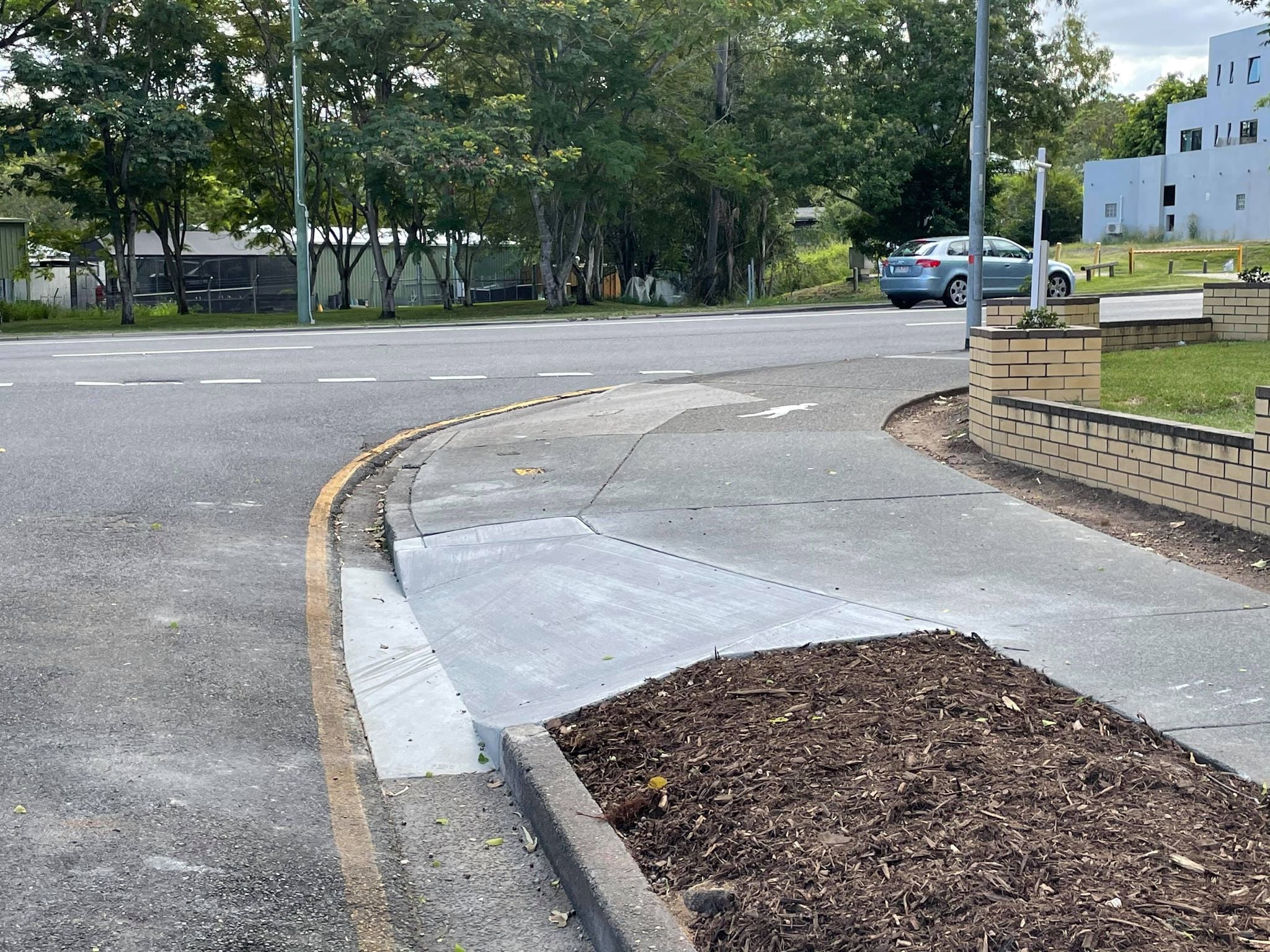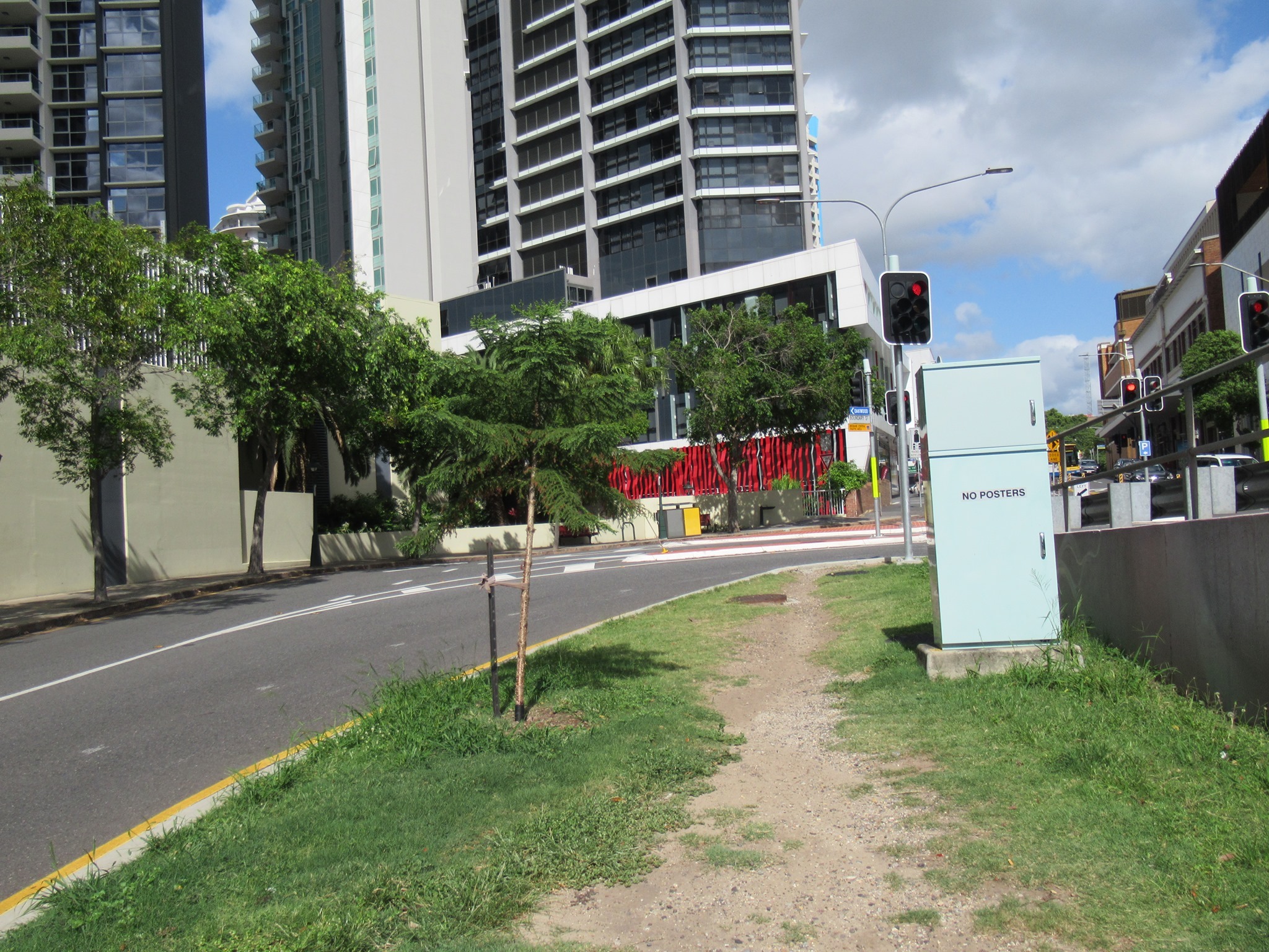 Back in 2017, Council spent around $2million of rate-payers funds “upgrading” the intersection of Ivory St and Boundary St in the CBD, as part of their program for “Projects Attacking Congestion”. That work included removing the footpath along the northern side of Boundary St, which is the most direct path from the top of Adelaide St and from Spring Hill towards the Story Bridge and to Howard Smith Wharves—including the new ferry terminal that will be built there soon. Council also removed the kerb ramps in an attempt to deter people crossing Boundary St near the intersection, and instead forcing them to take a detour including a driveway crossing, narrow footpath squeeze-point, and busy mid-block crossing with no pedestrian refuge.