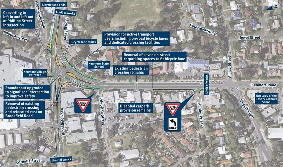 This week the Department of Transport and Main Roads (TMR) released a concept design to replace the roundabout at Moggill Road and Brookfield Road, Kenmore with a traffic light controlled intersection. They are seeking community feedback to inform a business case.