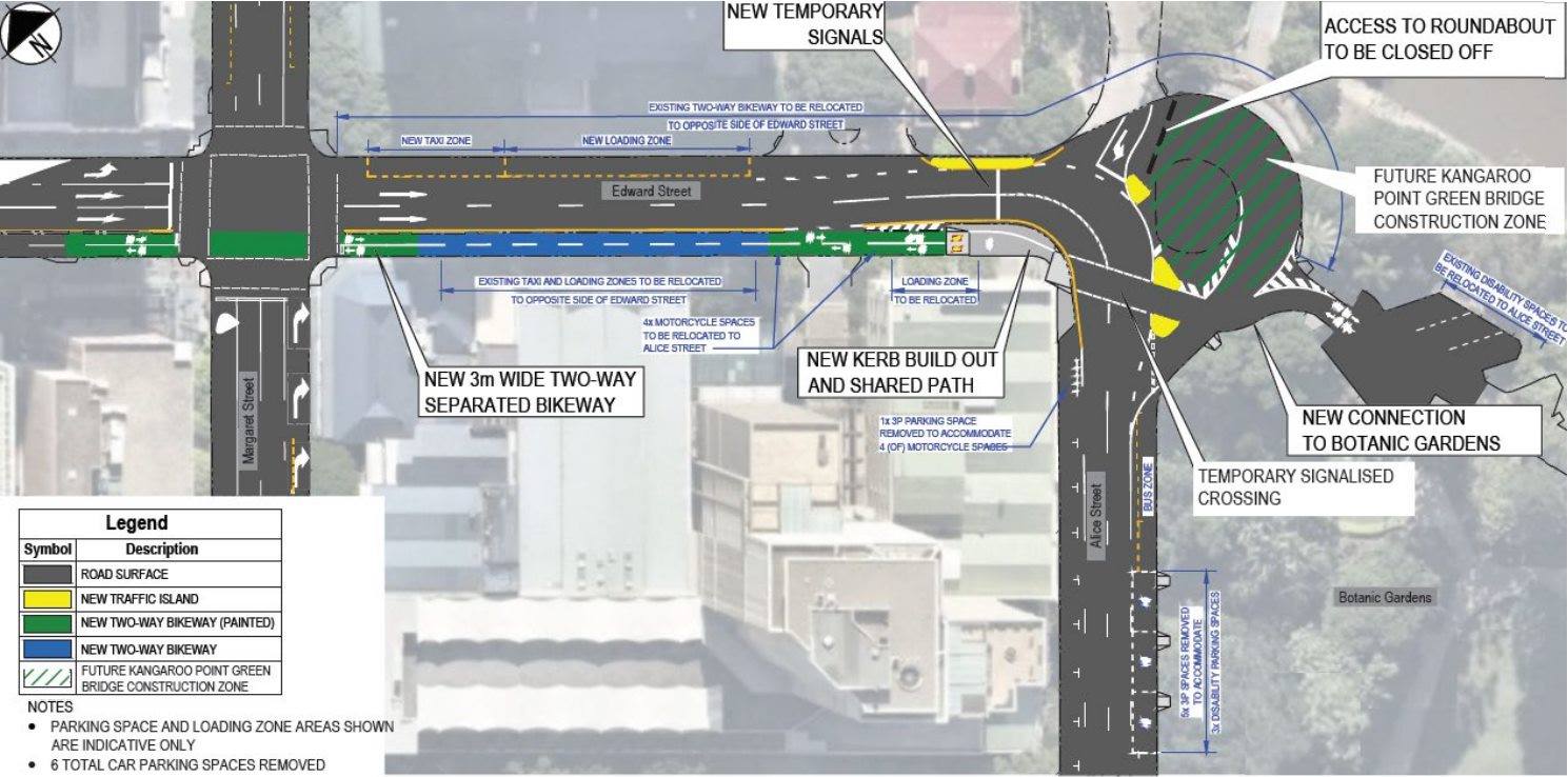 Good news for the CityLink Cycleway on Edward St in the CBD! In anticipation for construction of the Kangaroo Point Green Bridge, Brisbane City Council will be installing a temporary signalised crossing at the Edward Street and Alice Street intersection, and that means the cycleway will switch sides of Edward St between Alice St and Margaret St to run in front of the Port Office Hotel – where we created a pop-up protected cycleway for Parking Day in 2016! That will make the cycleway continuous between the Botanical Gardens and Elizabeth St, and will get rid of the exasperating delays at the intersection of Edward St and Margaret St.