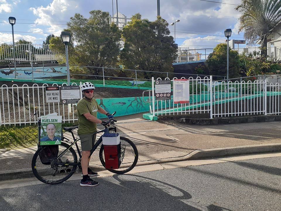 Later in the week, Belinda and Rolf Kuelsen, Greens candidate for Bulimba rode a lap around the Bulimba electorate checking out the train stations (Norman Park, Morningside, Cannon Hill and Murarrie) and ferry terminals (Apollo Rd, Bulimba, Hawthorne, and Norman Park). It was thirsty work.