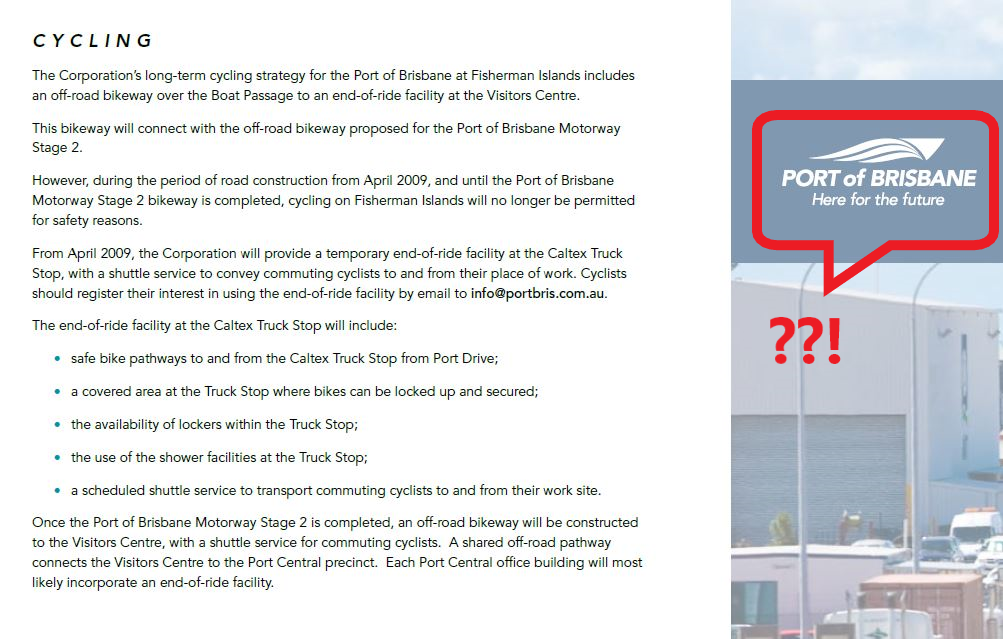 We know that there are port workers who are keen to cycle to work, but who are prevented from doing so. We believe this is a failure of corporate and social responsibility by the Port and a failure of governance by the Queensland Government.