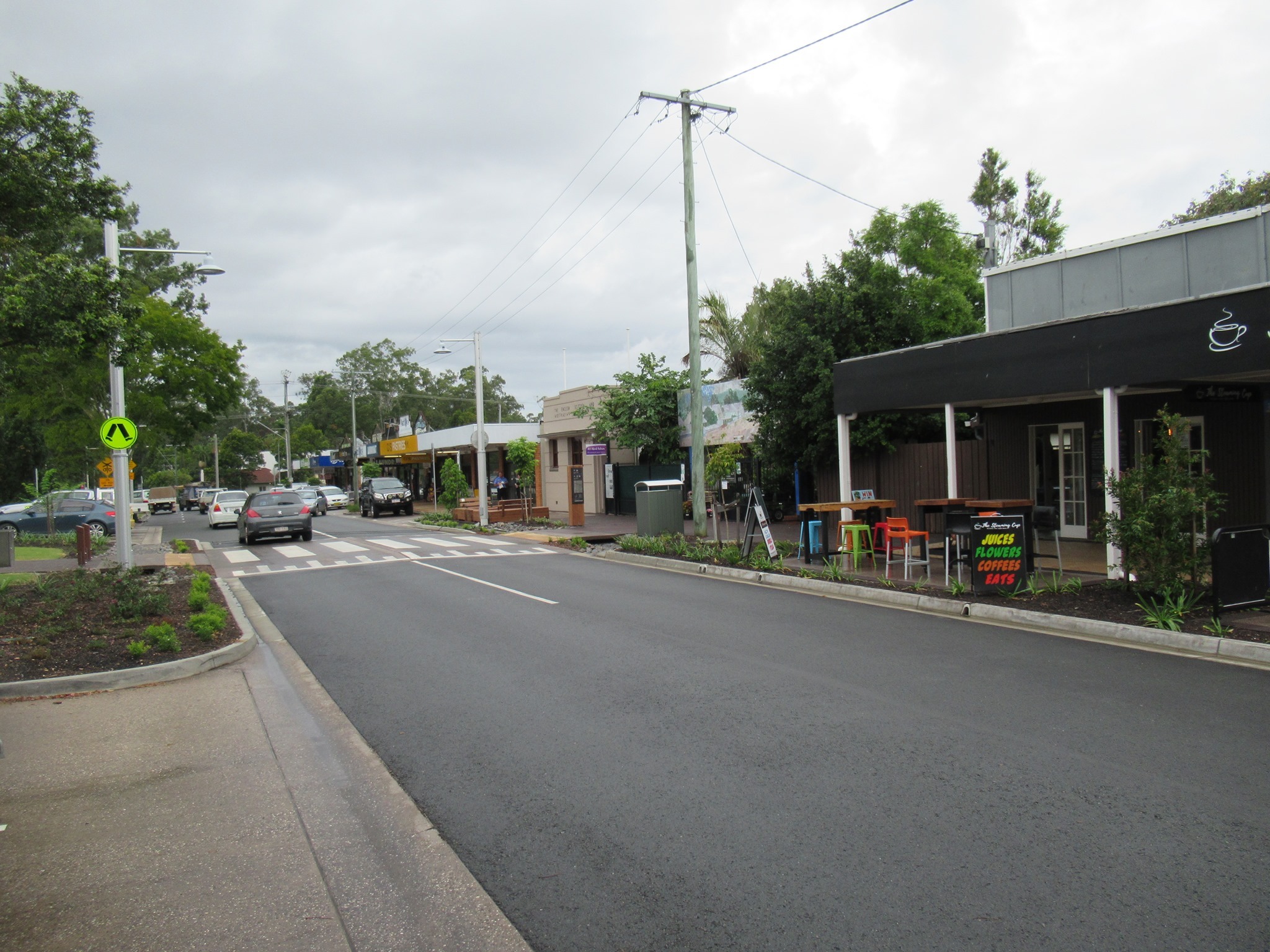 On our recent travels we noticed that Cribb St, in the Sunshine Coast town of Landsborough has recently had a facelift. It’s amazing how much more inviting it feels now after the street has been narrowed, the traffic calmed, and car parking removed from directly in front of the shops. Now the local businesses are visible and much more inviting, with room for outdoor dining or to catch up for a chat. We really like the wombat crossings (raised pedestrian crossings) – particularly on the side street, so that pedestrians have obvious right of way and a level pavement. One objection we’ve heard in Brisbane is that buses can’t handle speed platforms – but that doesn’t appear to be a problem in Landsborough.