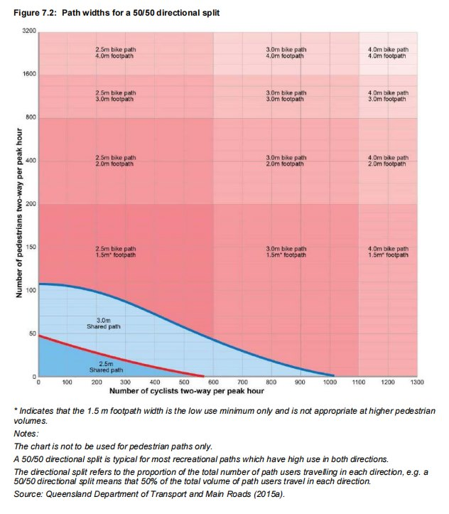 Having spend time living in The Netherlands, Ross understands the value of comfortable cycle paths that allow for social cycling side by side. The moving envelope for a person on a bike is 1m, so a 3m path allows two people cycling (or walking) side by side to comfortably pass a person travelling in the opposite direction. 2.5m is functionally not much different to 2.0m in that it requires everyone to regularly shuffle to single file. (Of course the gold standard for higher-use paths is to provide separated space for people walking and for people cycling.)