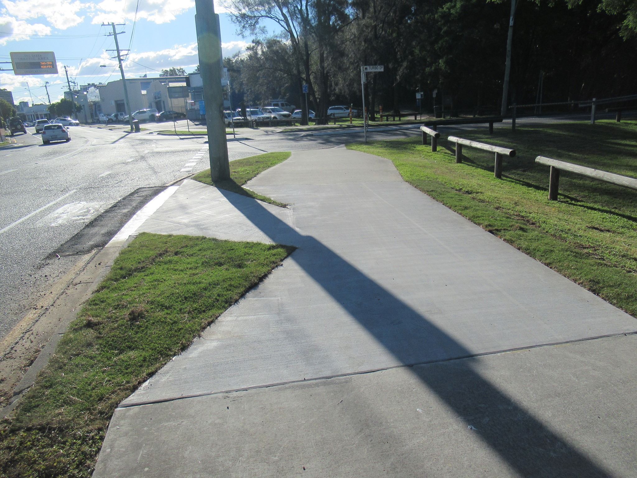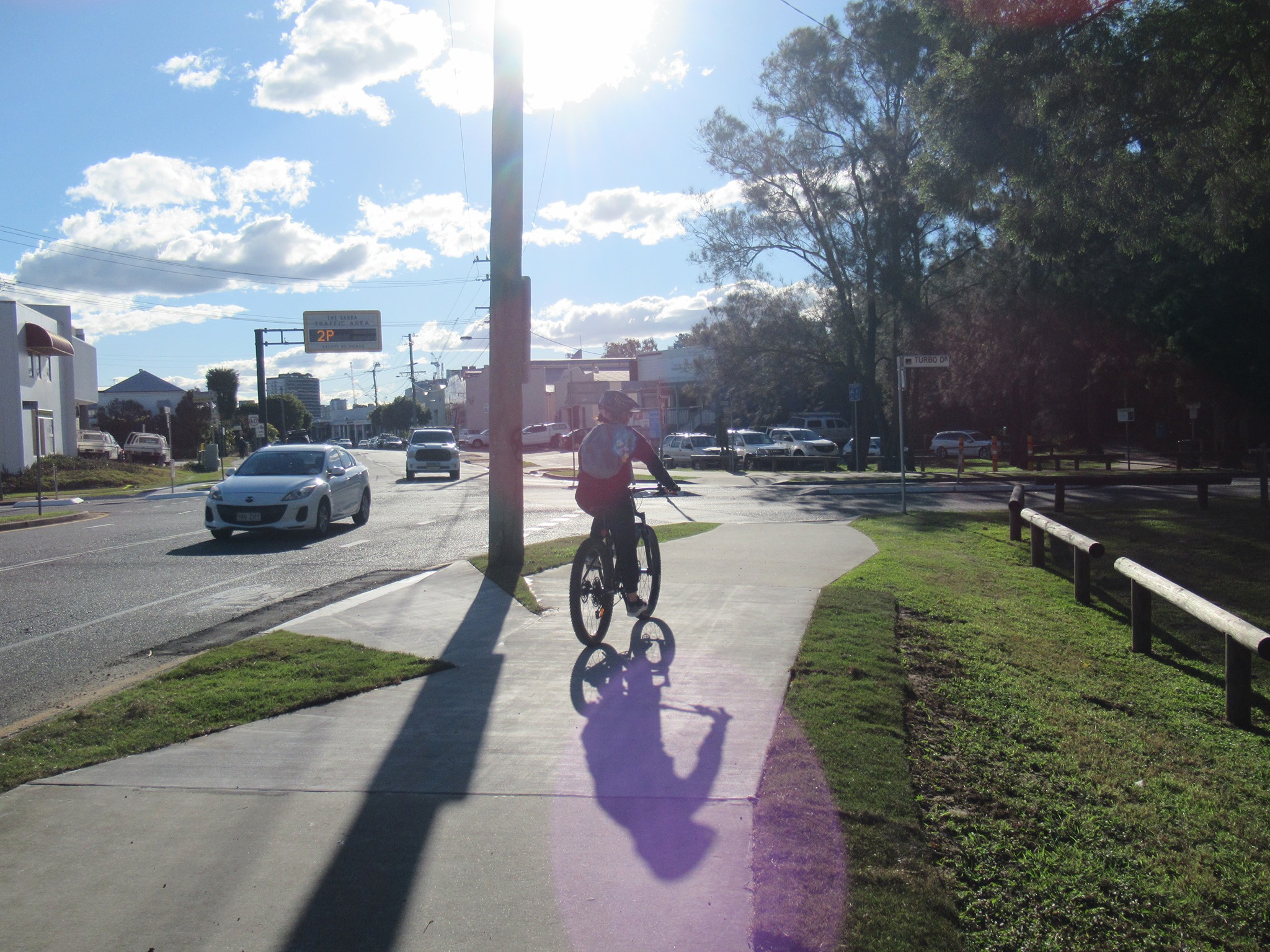 We’re a bit mystified by the geometry here on Main Ave (Deshon St) Woolloongabba. The ramp allowing cyclists to transition from the road to the shared path just after Turbo Drive is good, but why has the path been narrowed with the grass wedges?