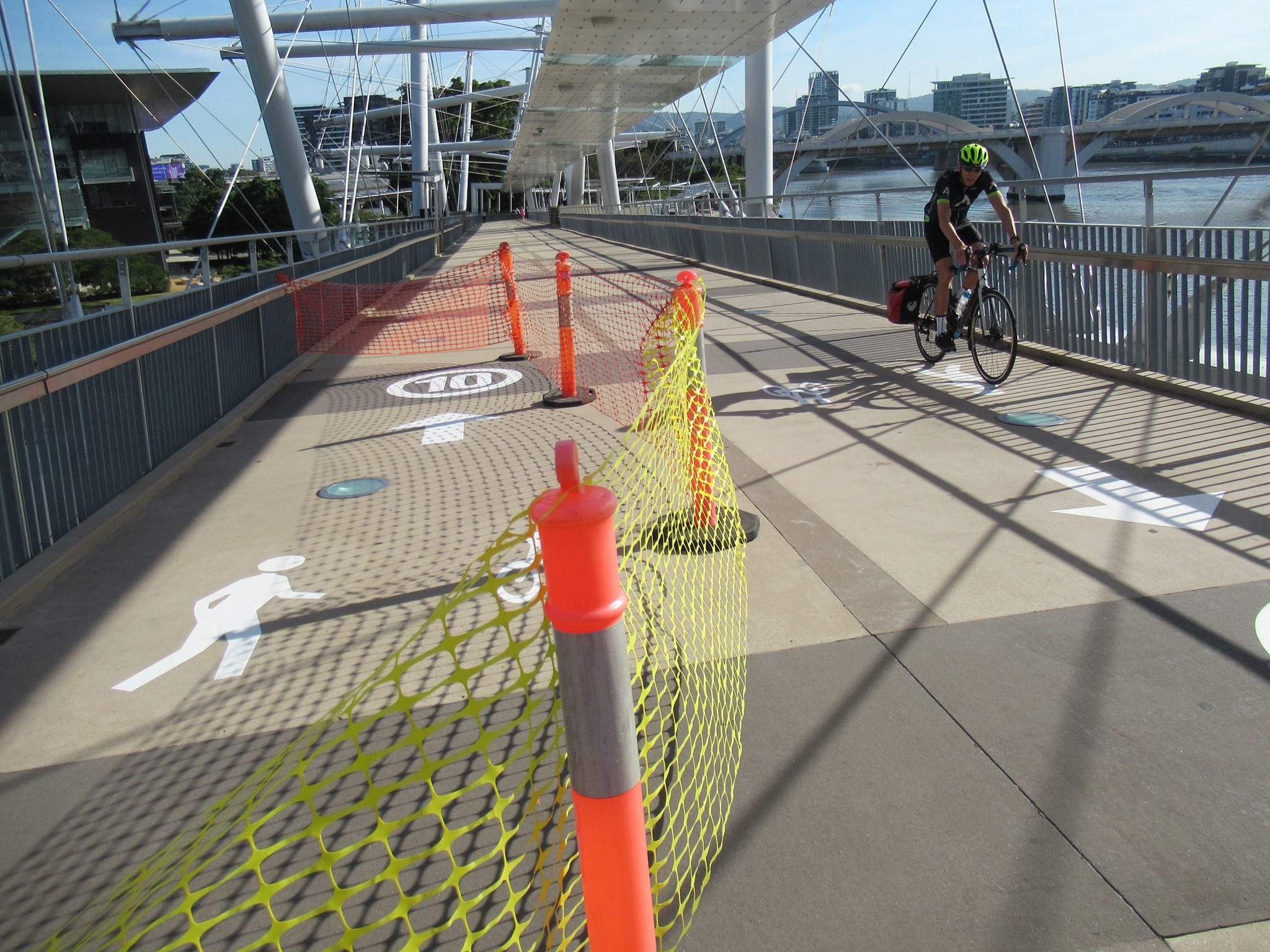 There are some minor safety issues on the Kurilpa Bridge: the gradient and curvature, the light covers which are slippery when wet, and the clutter of bollards at each end. Also, people walking don’t always stay left; they tend to walk in the shade/shelter; and they can often stop suddenly or cross the bridge to check out the view. But all of that applies to any other shared path in Brisbane, most of which are much narrower.
