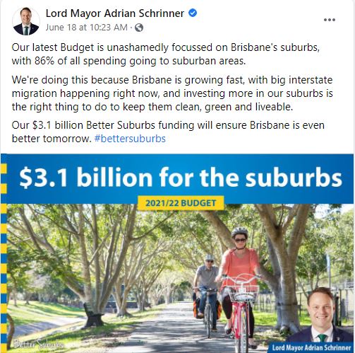 The Lord Mayor and his team are certainly talking up their investment in cross-river green bridges (and the one over Breakfast Creek), but despite the rhetoric and images of happy people on bikes, we’re not yet convinced that this latest budget really takes the the bold steps necessary towards a healthier Brisbane. We’re still working through the details, and will publish more on this soon.