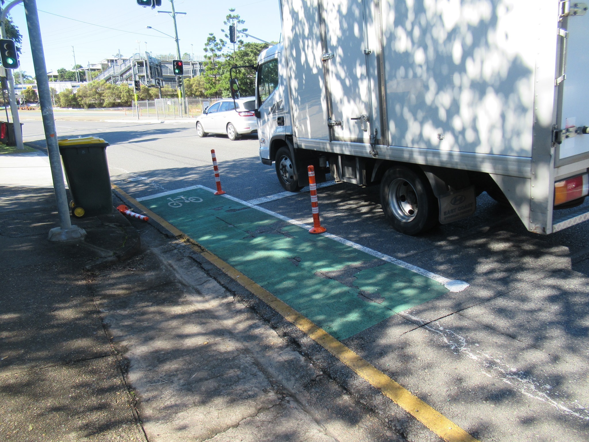 An update from East BUG on the flexi-bollards at the intersection of Wynnum Rd and Jack Flynn Memorial Drive in Morningside: after standing up valiantly for a fortnight, and taking hit after hit, two of the little plastic posts have succumbed. RIP. How long can the rest hold out?