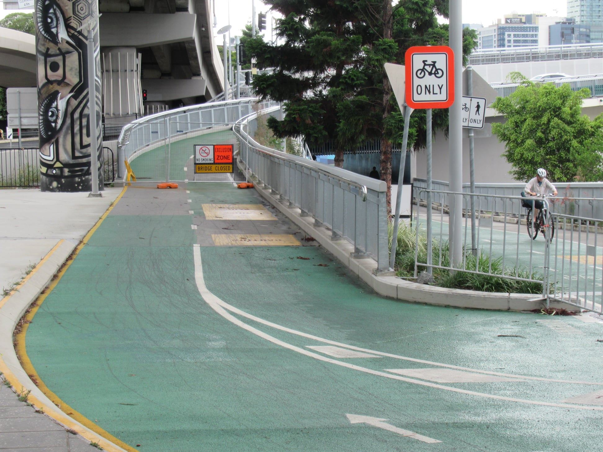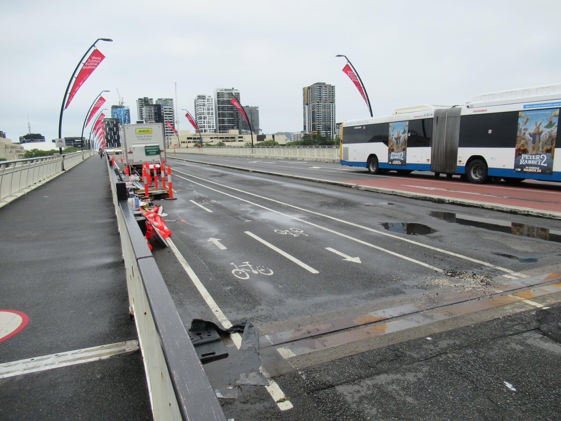 The wet weather doesn’t seem to have interrupted work on the CityLink Cycleway connection along William St to the Victoria Bridge this week. It’s starting to look tantalisingly close…