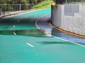 Brisbane North BUG have also reported a hazard on the North Brisbane Bikeway where it goes under the railway tracks by Breakfast Creek at Windsor. Poor drainage in this area has created very slippery conditions. As you can see from our photo, the drain that is supposed to take the water across the path is a couple of metres away from the low point in the gutter. And unfortunately, water doesn’t flow uphill, so it seeps across the path for days or weeks after heavy rain, creating perfect growing conditions for a layer of slime. Be careful – try not to turn as you ride or scoot through the bottom of the dip.