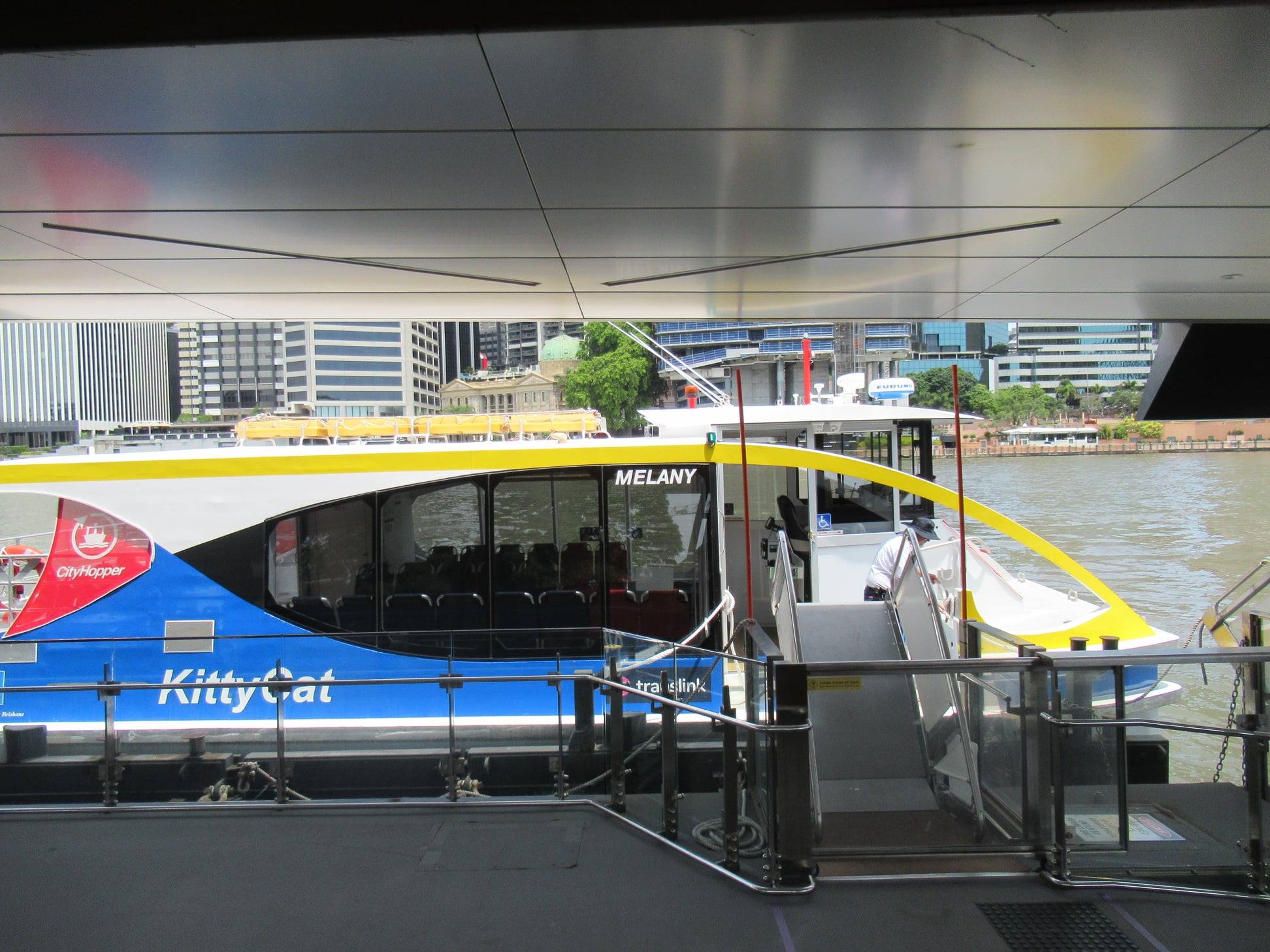 This week a fleet of new (to Brisbane) KittyCat vessels started work on the Brisbane River servicing the free inner-city CityHopper route, and providing a cross-river ferry service between Thornton St and Riverside. Although there are no bike-racks onboard these vessels, we are happy to confirm that it is much easier to manoeuvre a bike on and off them than the older wooden-hulled vessels they are (temporarily?) replacing, and which are still in use between Bulimba and Teneriffe.