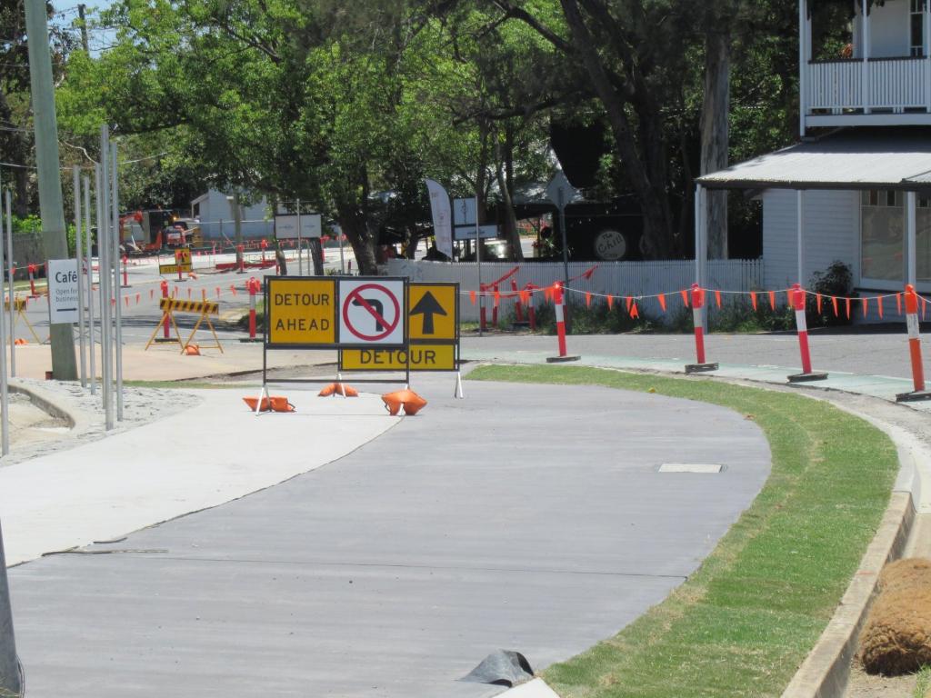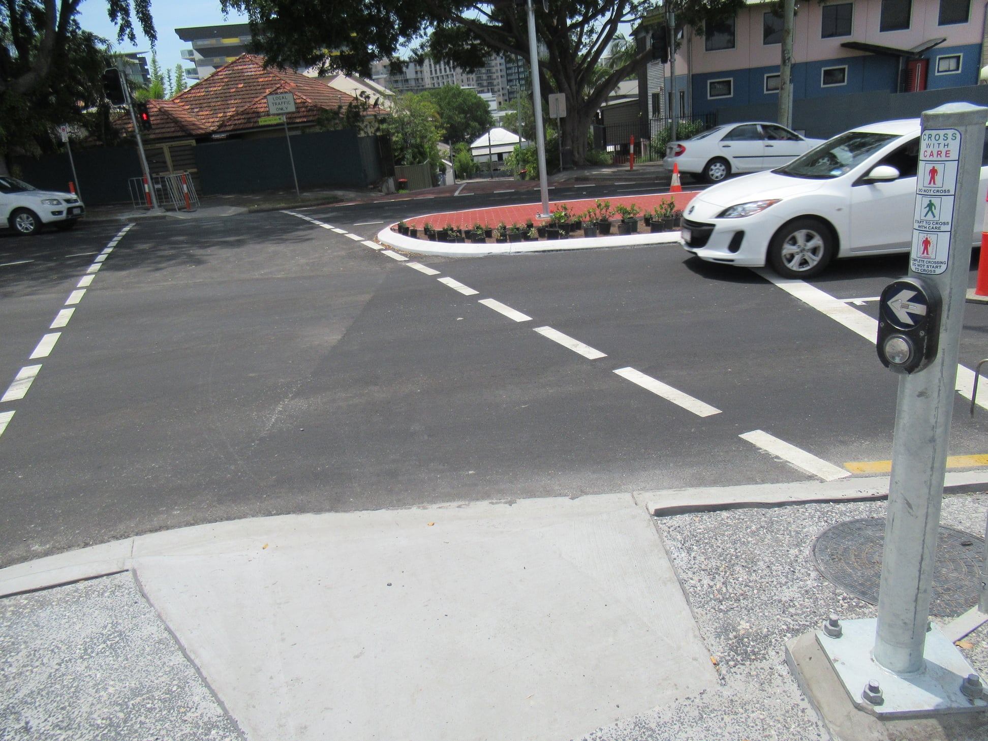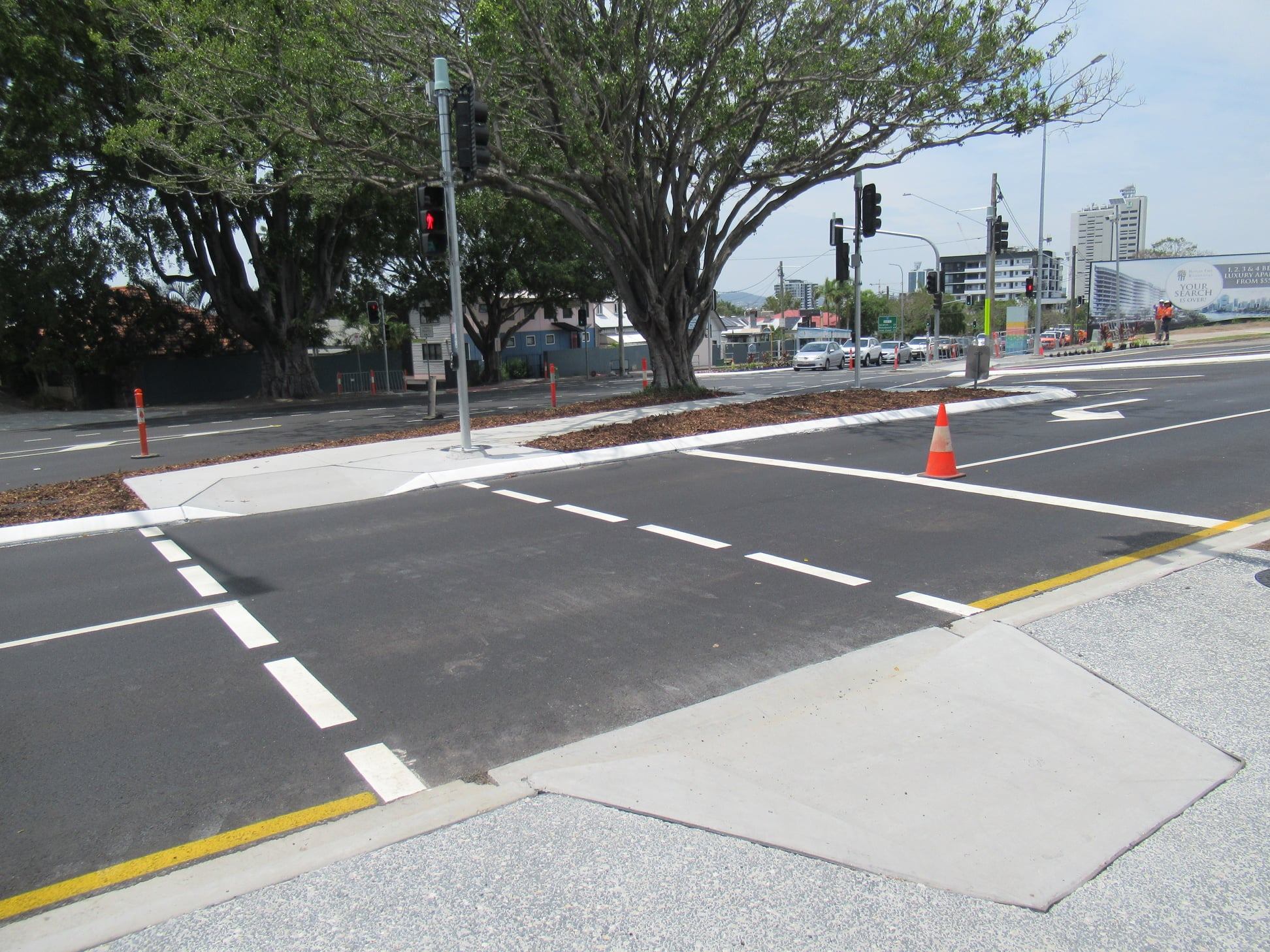 We just received notification on Wednesday that the project to “upgrade” the intersection of Main St and River Terrace in Kangaroo Point is now complete. That was surprising, as there still appeared to be a lot of work left to finish the shared path along Main St.