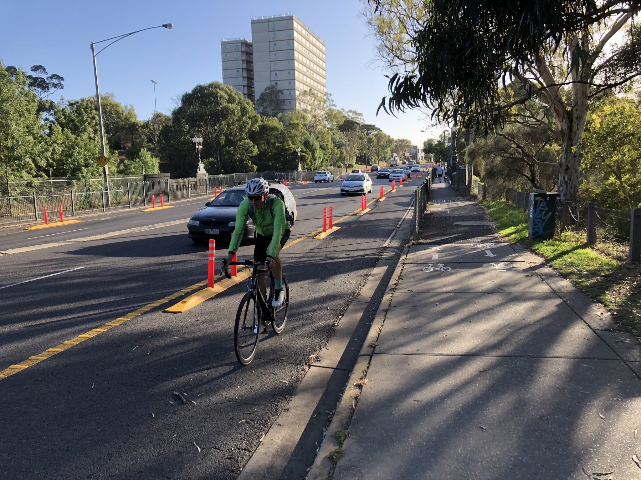 Check out these pictures of Heidelberg Rd, Clifton Hill – about 5km north-east of Melbourne. One of the three general lanes (in each direction) has been converted to a protected bike lane.