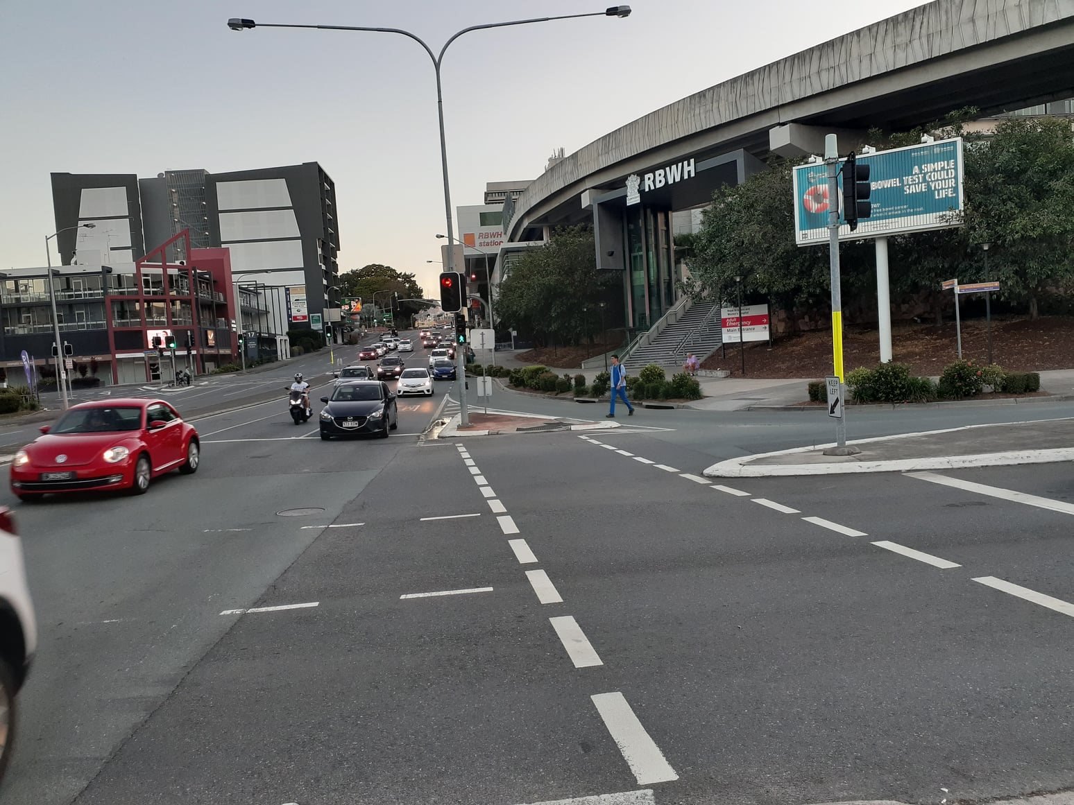 If you walk or ride a bike or scooter to the Royal Brisbane and Women’s Hospital, or between The Valley and the Enoggera Creek Bikeway, you have probably experienced how difficult and potentially dangerous it can be to cross the slip-lanes at the intersection of Butterfield St and Bowen Bridge Road. The current intersection layout is totally unsuitable in such proximity to a major hospital, where hundreds of essential healthcare workers and their clients need to cross every day.