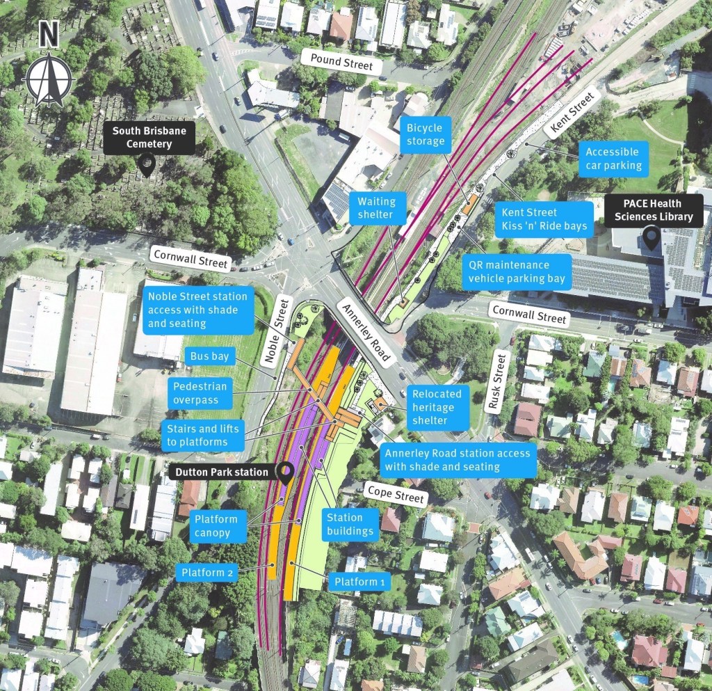 From our observations, most passengers arriving at Dutton Park Station in the morning walk from there along Cornwall St towards the medical precinct. The new plan appears to have these people using the station overpass, but then having to either cross the slip lane and Annerley Rd, or go down to the eastern platform, and walk north along the platform under Annerley Rd, then exit the station and walk back up the hill again to get to Cornwall St.