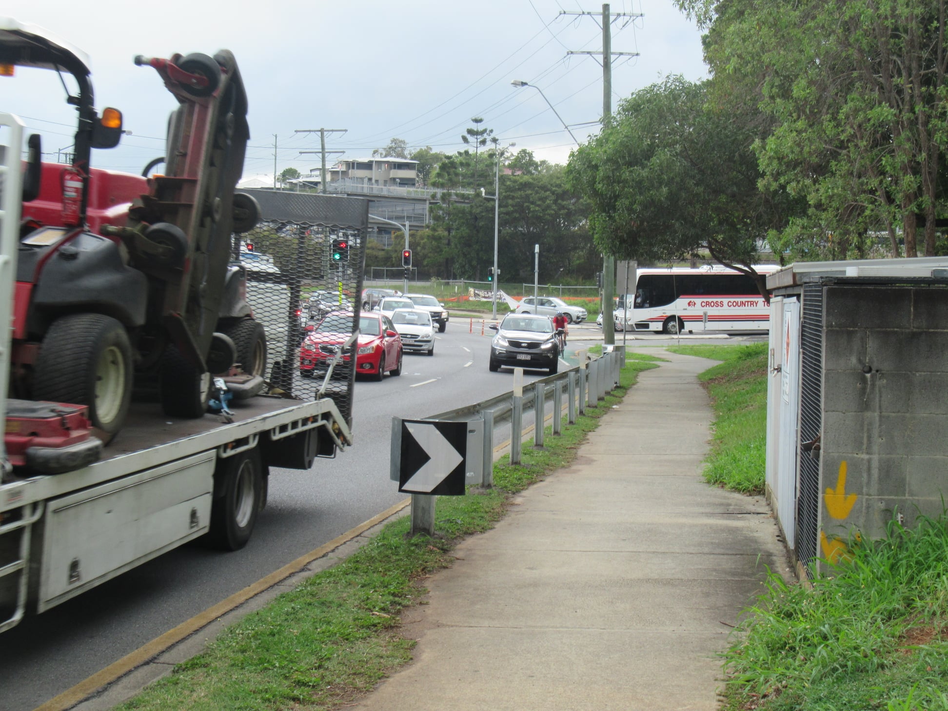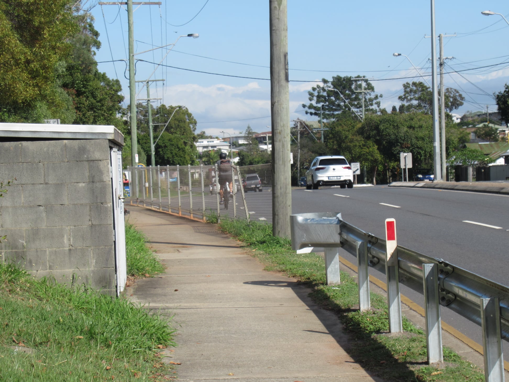 The curved end of the guard rail recently installed on Wynnum Rd Morningside, inbound just past the intersection with Jack Flynn Memorial Drive, protrudes into the path. Compared to the bus stop further along, and the various sign posts in the middle of the path, that’s a minor matter, but it does raise a number of concerns: