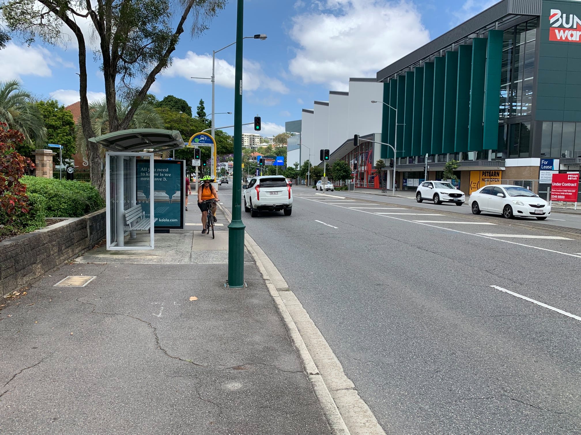 We stressed that we’d like to see a solid barrier and as much distance as possible between the bikeway on Breakfast Creek Road and oncoming motor vehicle traffic. (The low yellow plastic curbs which work well for the temporary solution in the CBD would not be enough here. Something more like the concrete dividers used on the Gabba Bikeway would be better.)